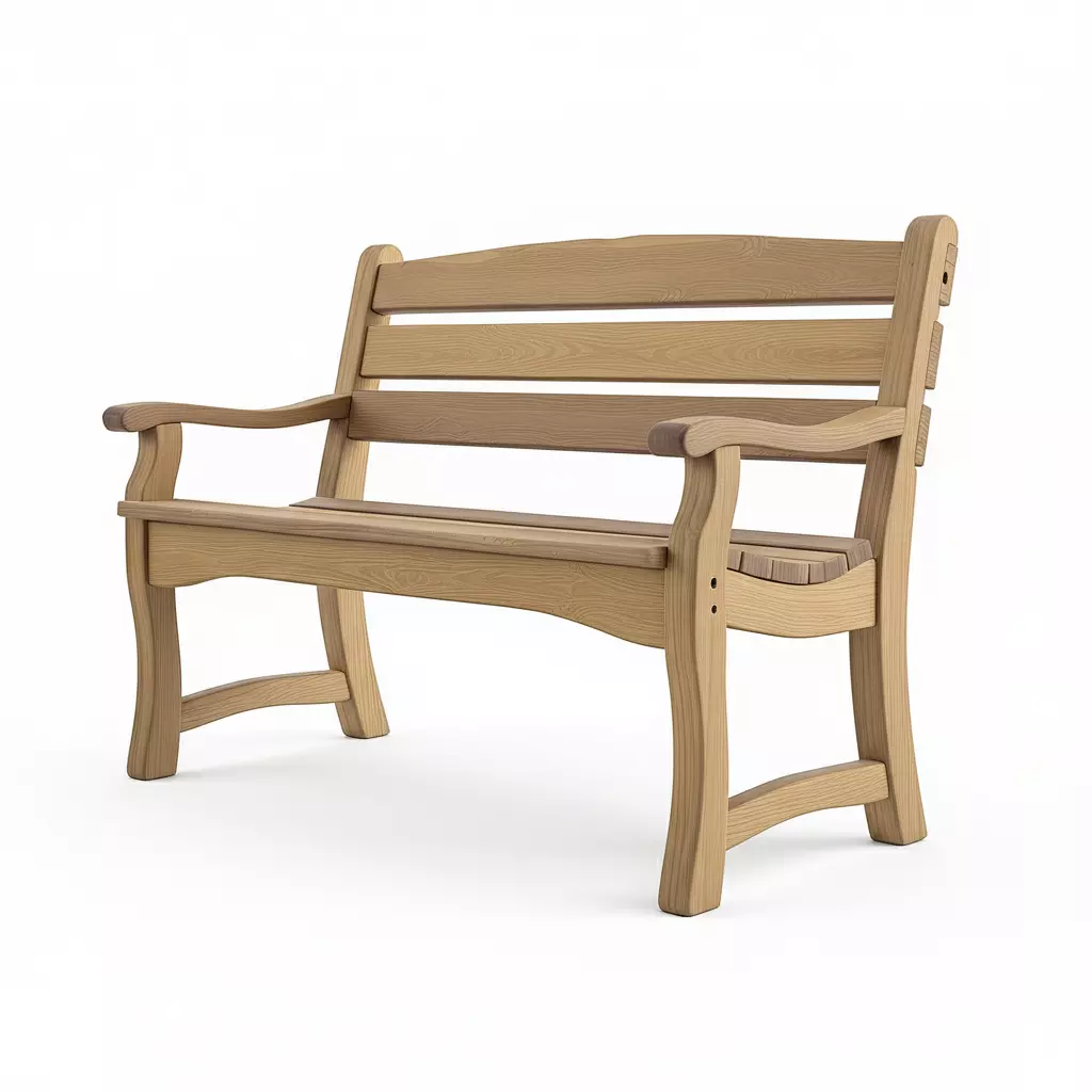 This is a clean and appealing 3D model of a classic two-seater outdoor bench. The design features a smooth, natural light-colored wood texture, likely representing light oak, pine, or ash. It has a traditional slatted back and seat, with gently curved armrests and legs, giving it an inviting and comfortable appearance. The sturdy construction and timeless style make this model an excellent asset for enhancing architectural visualizations of parks, gardens, patios, backyards, or any outdoor public or residential setting.