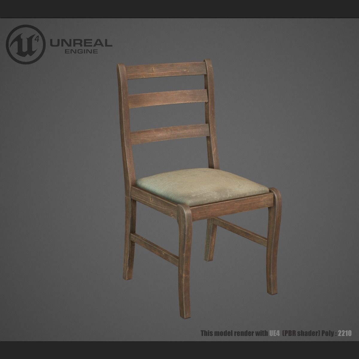 Wooden chair Texture size : 2048x2048 (Albedo, Normal, AO, Roughness) Files format : FBX, OBJ, MAX 2016 Model render in UE 4 engine