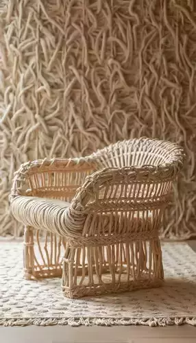 Download the serene 3D model of a woven rattan chair, a digital recreation of a handcrafted, bohemian-style lounge seat designed to evoke warmth, texture, and artisanal charm. This rattan chair 3D model features an organic, sculptural form crafted entirely from thick, natural-fiber rope — meticulously wrapped and interlaced to create a seamless, flowing silhouette. The backrest and armrests curve gently outward, embracing the body with ergonomic comfort, while the seat is wide and slightly concave for optimal support. The base is constructed from vertical strands that taper inward, forming a stable, open-lattice structure that enhances its airy, lightweight appearance. Every strand is modeled with fine detail — showing subtle variations in thickness, slight fraying, and natural color shifts from beige to warm tan — mimicking real handwoven materials.