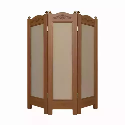 This sophisticated wooden privacy screen features a beautifully carved frame with elegant brass hinges, creating a premium folding partition for banking consultation spaces. The design incorporates delicate fabric panels that offer privacy while maintaining an open, welcoming atmosphere. Each panel is securely attached to the sturdy wooden frame, which showcases intricate craftsmanship and attention to detail. The folding mechanism allows for flexible positioning to create intimate consultation areas. The model includes four detailed views: the front showing the fabric panels and carved frame details, the back revealing the hinge construction and frame support structure, the left side displaying the screen's height and fold angle, and the right side highlighting the carved embellishments and polished brass hardware. Perfect for adding both function and aesthetic appeal to modern banking interiors.