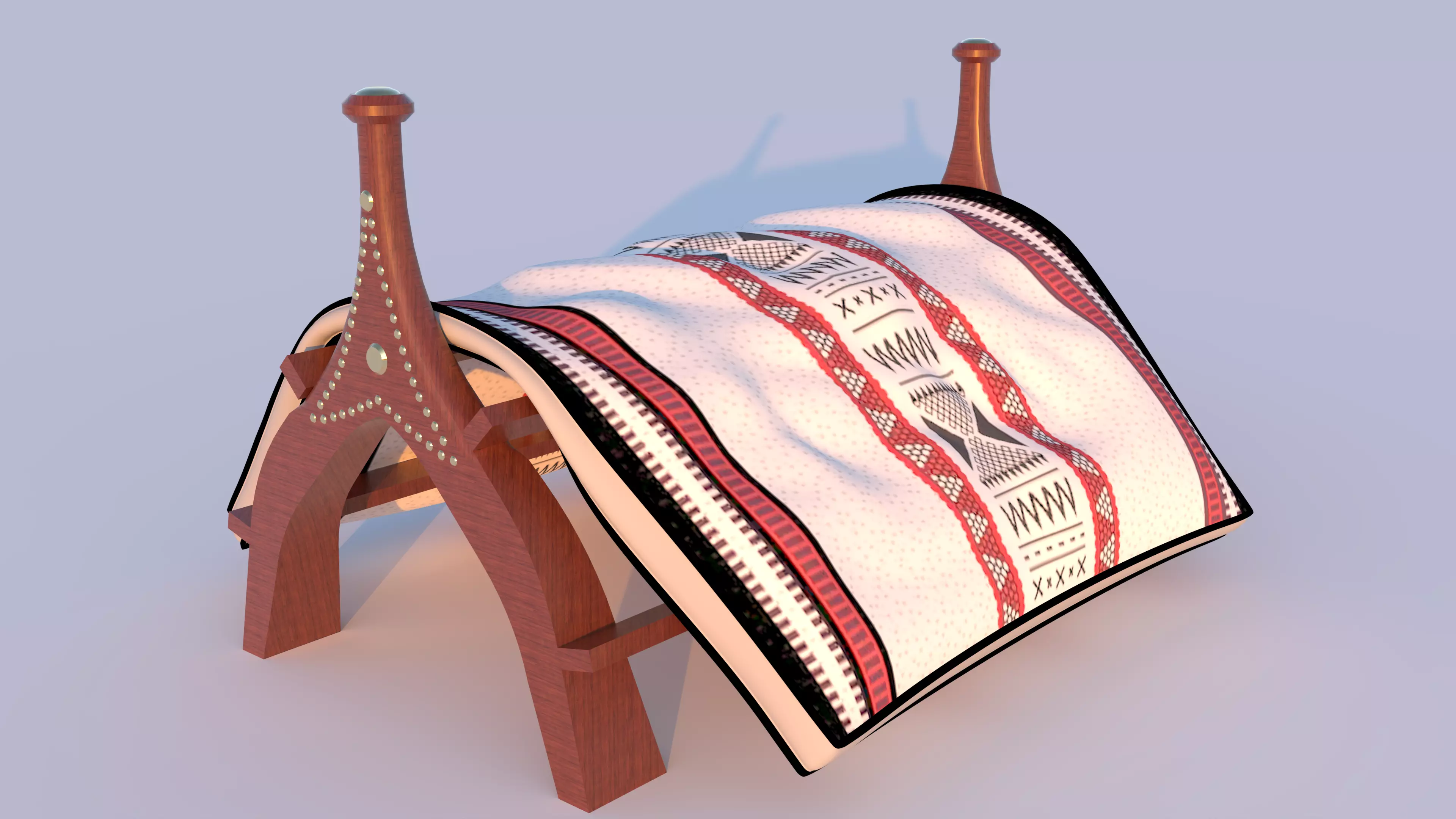 A highly detailed 3D model of a traditional Arabian wooden saddle (Marka), crafted to capture authentic heritage aesthetics. The structure features intricately carved wood with decorative patterns and is covered with a beautifully embroidered fur blanket, showcasing classic geometric Arabian designs. Perfect for use in heritage scenes, games, interior designs, and cinematic projects.