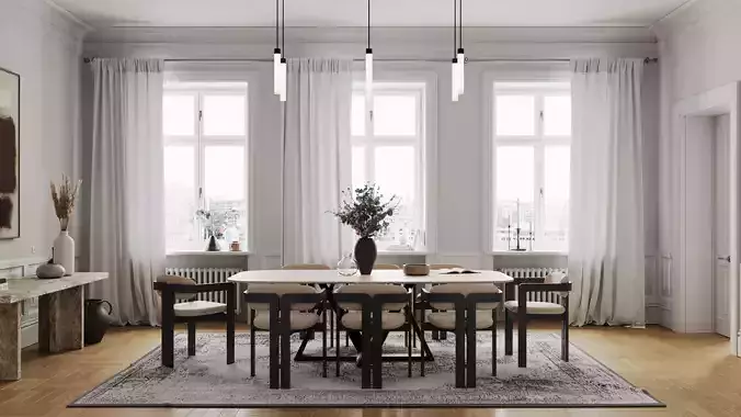 Archmodels vol. 306 is a collection of 40 complete dining sets for architectural visualization, featuring over 400 individual 3D models. Each set includes a table, chairs, pendant lighting, and wall decorations—ready to use without additional arrangement.Styles range from Scandinavian minimalism through mid-century modern to bold art deco-inspired compositions. Diverse materials and color palettes allow matching any project's character. Perfect for architects and visualization artists, this collection is a great addition to any 3D library—saving hours of modeling and scene setup time.