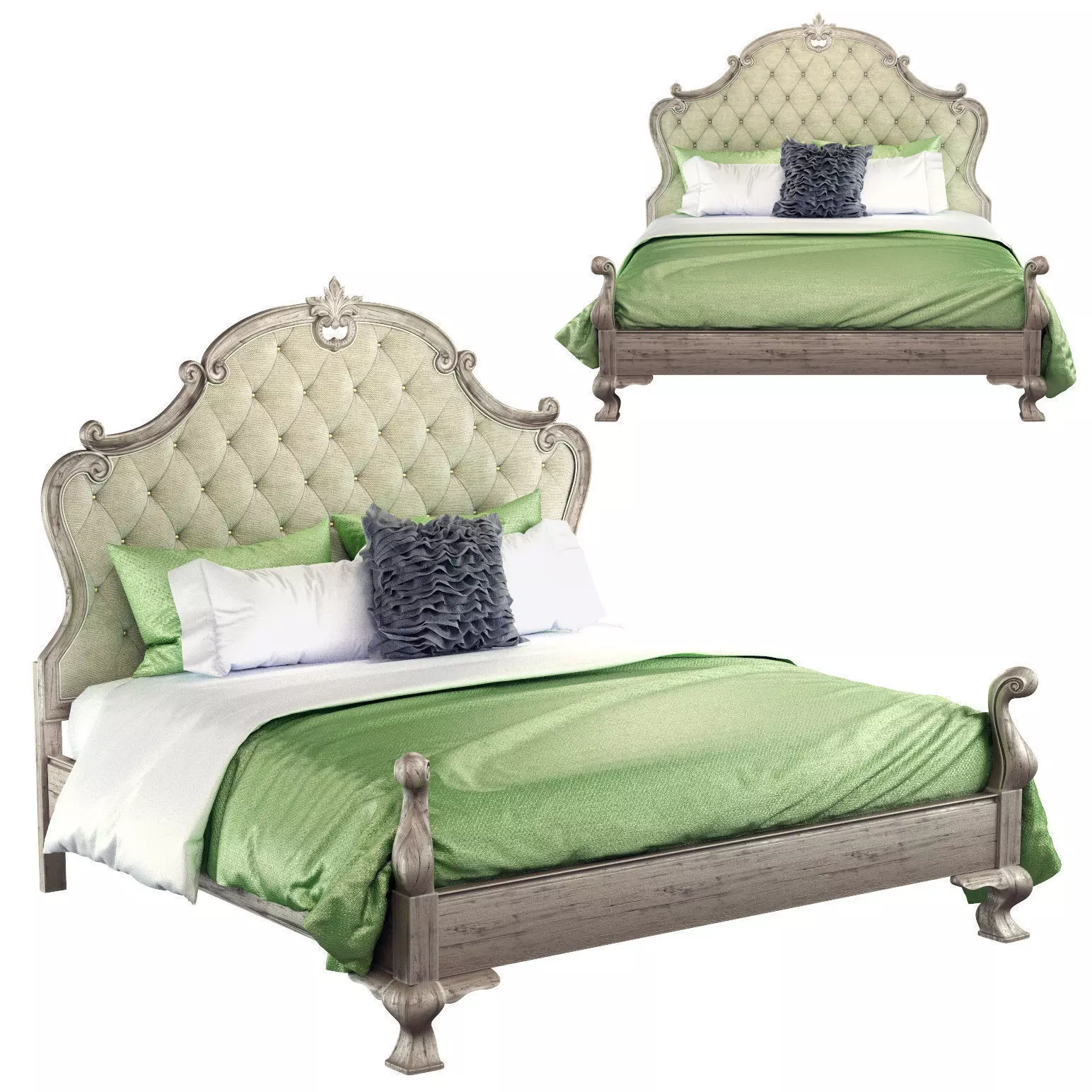 Flat Cut White Oak veneers Weathered Sand finish Wood-framed headboard with decorative carving and upholstered, button-tufted panel with welt Wood side rails and footboard with carved posts Three slat support system with adjustable center supports