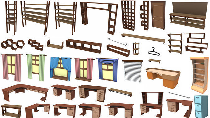 The package includes the following types of cartoon furniture props:window, door, desk, cabinet, shelves, rack, hanger, blackboard.