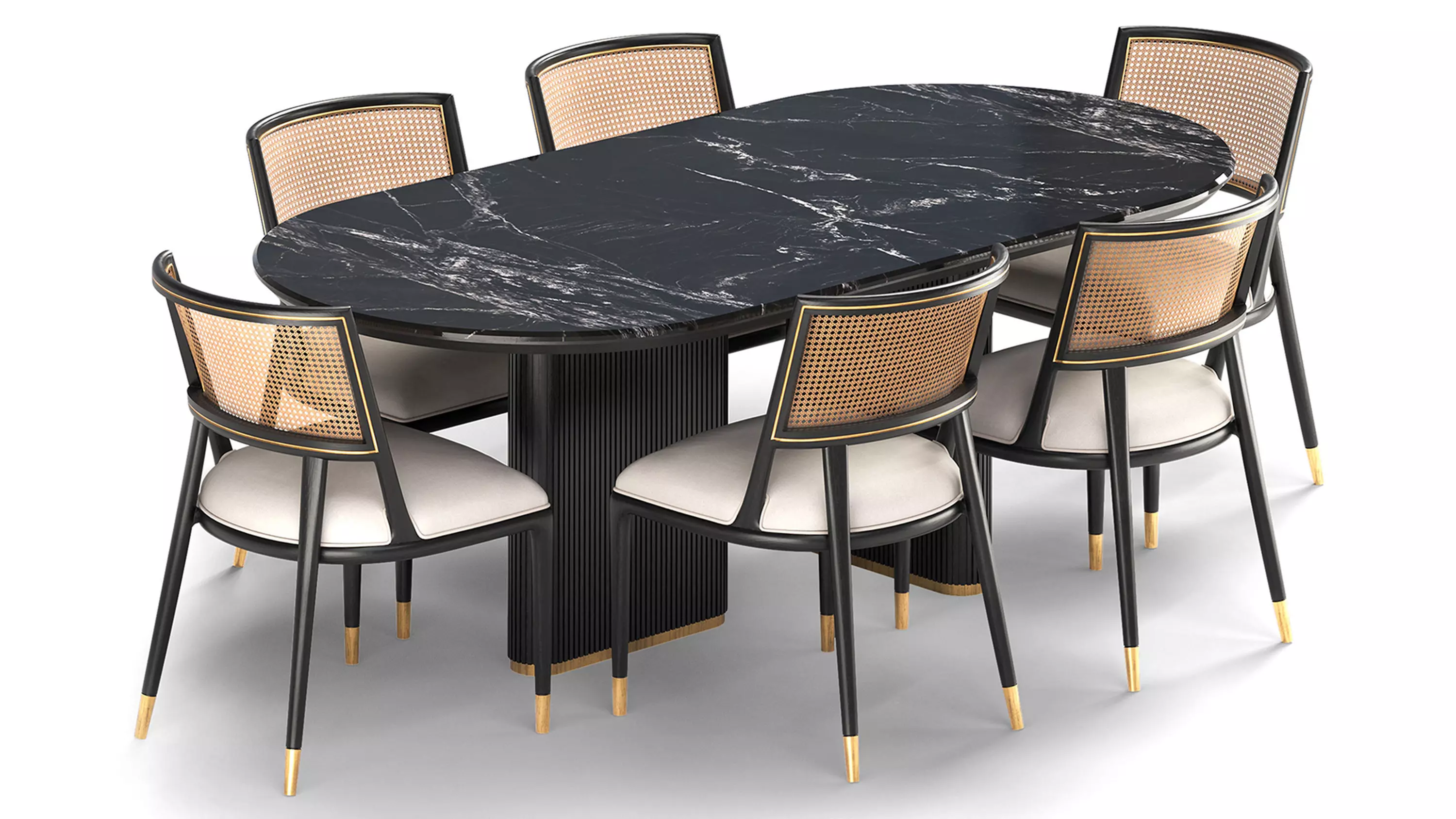Elegant 3D model of a luxury dining table set with 6 chairs.This high-end set features a black marble tabletop with white veining, supported by a fluted cylindrical base. The chairs combine a sleek black wood frame, natural cane backrest, and gold metal accents on the legs, paired with light upholstered cushions.