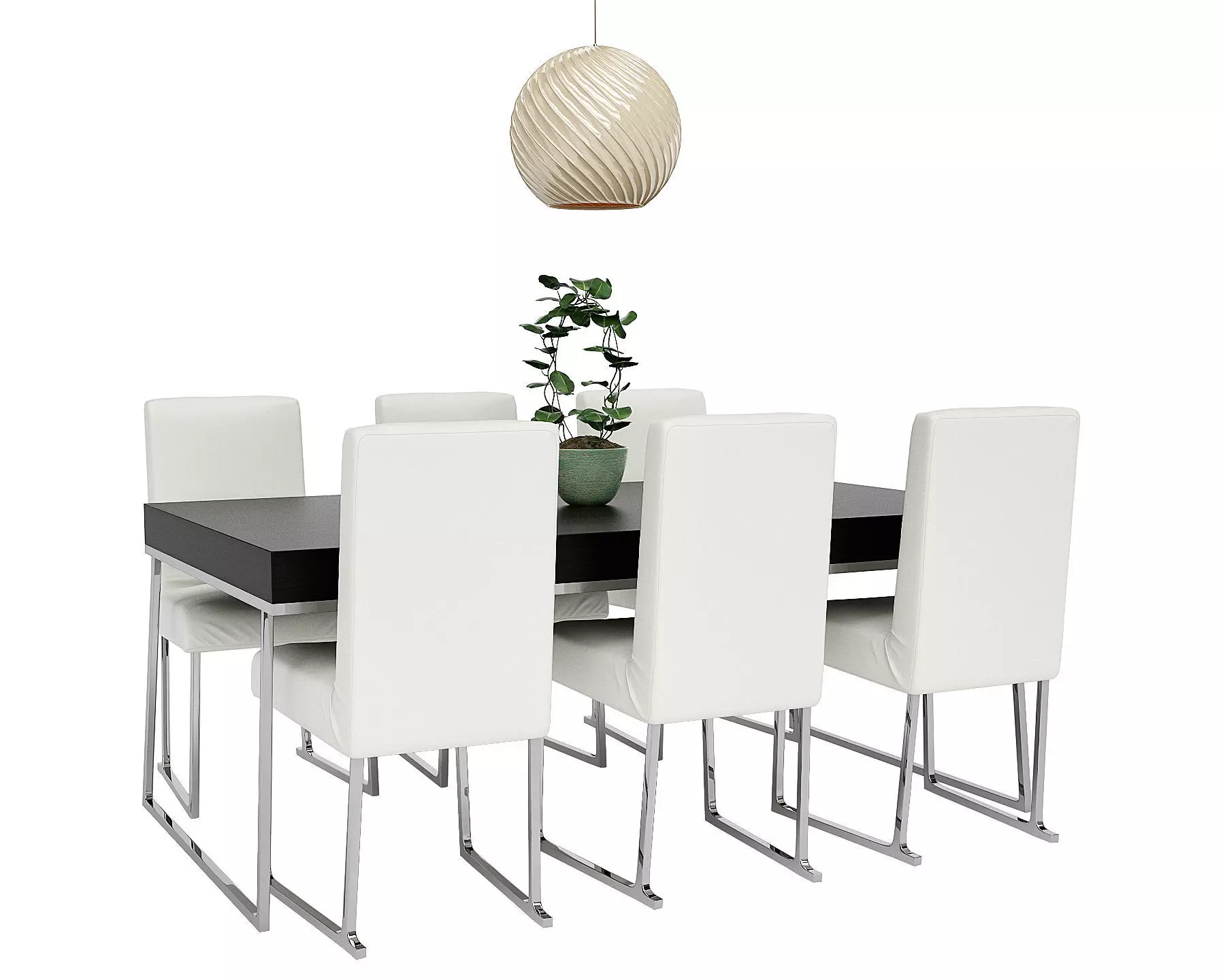 High quality 3d models set of complete dining setup with a dining-table, modern type of royal chairs, beautiful plant with pot, a modern ceramic patterned ceiling light everything with all maps included.