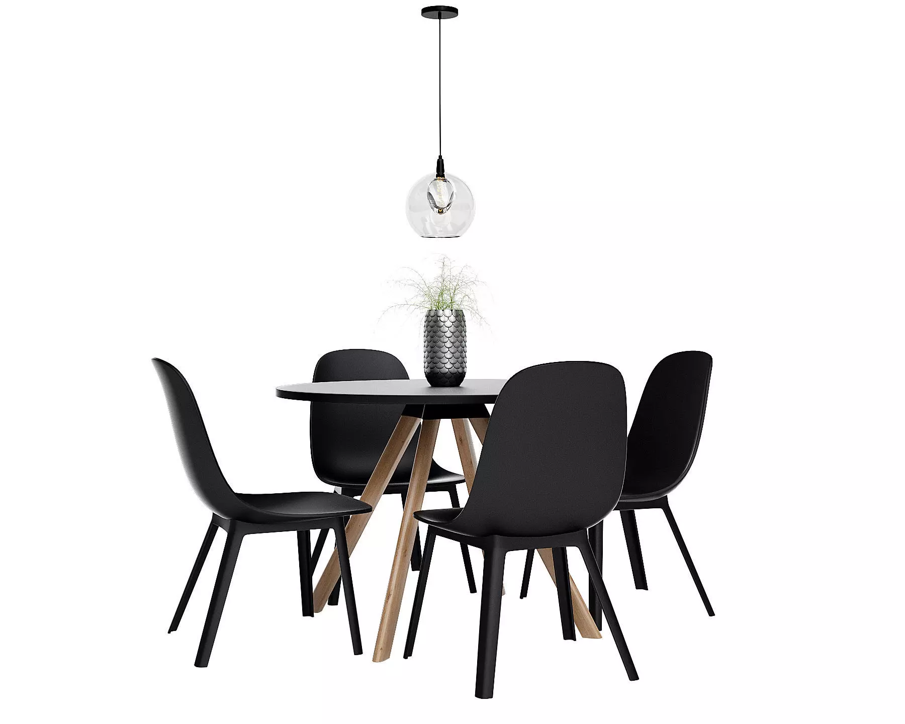 High quality 3d models set of complete dining setup with a round dining-table, modern type of scandinavian tone downed black chairs, beautiful vase with green plant, a classic glass ceiling light everything with all maps included.