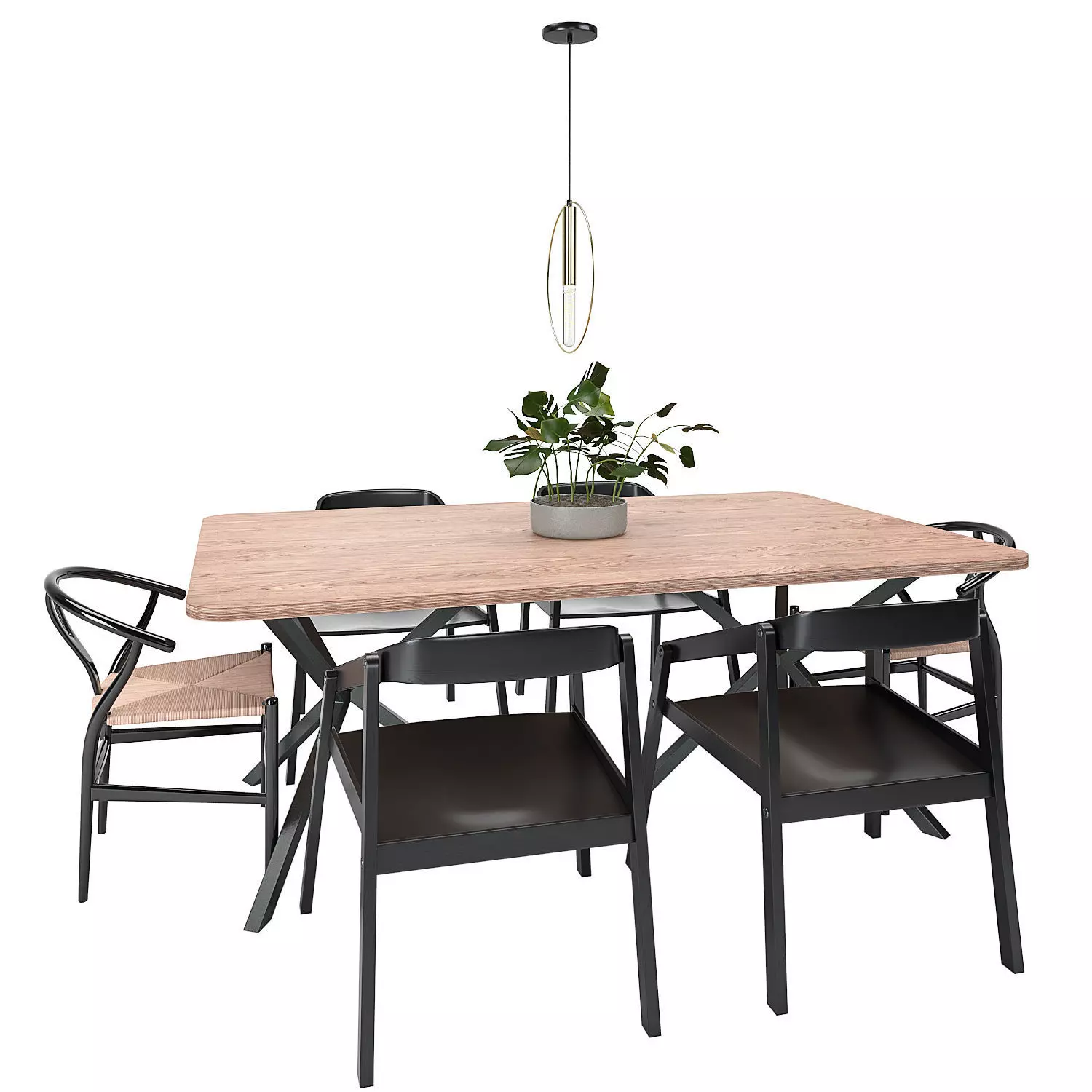 High quality 3d models set of complete dining setup with a dining-table with wood and gloss wood feets, modern type rattan and wood chairs, beautiful green plant with vase, a modern gold ceiling light everything with all maps included.