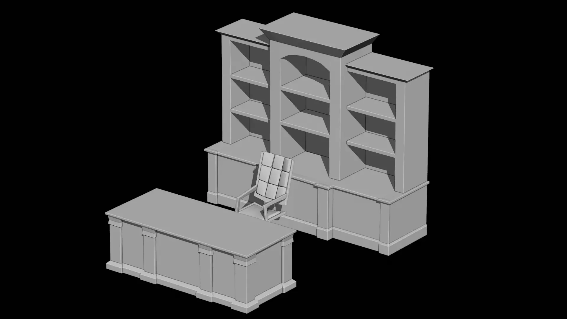 A professional-grade office furniture set including a large desk, high-back chair, and bookshelf. The geometric precision makes it ideal for architectural walkthroughs or corporate-themed game levels.