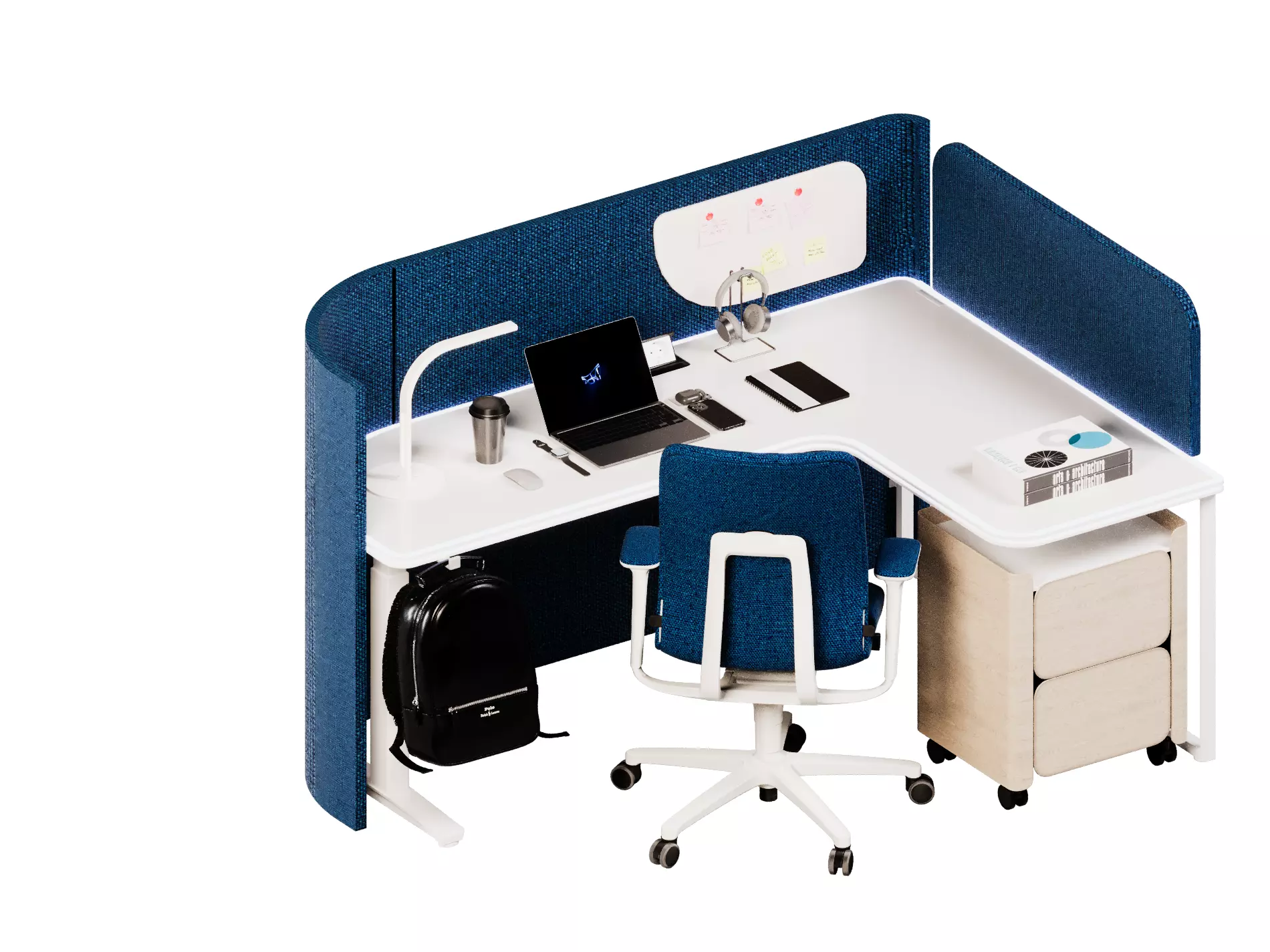 This futuristic office workstation 3D model features smooth flowing geometry and curved acoustic partitions, inspired by next-generation workspace and contemporary futuristic design language.
