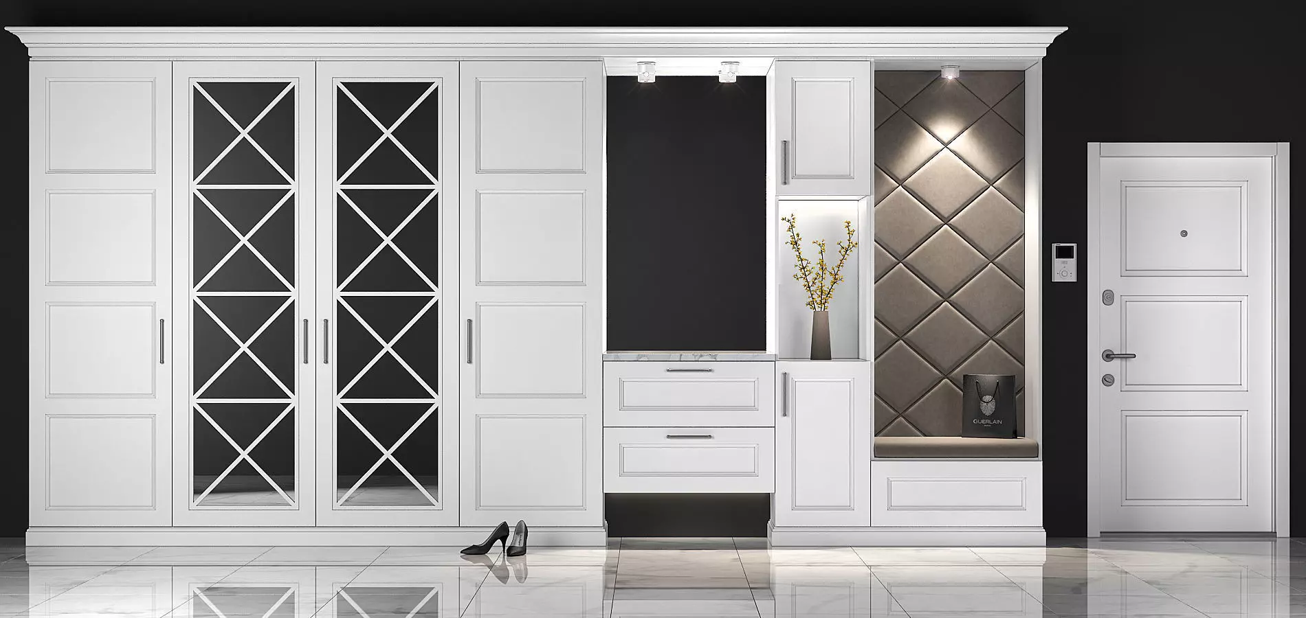 Furniture composition for the hallway or bedroom. Furniture composition consists of separate grouped modules for easy editing. Units: Millimeters Dimension: 5300(W) x2700 (H) x 450 (D) mm Render: V-Ray 2,20 Formats: 3ds Max 2010, FBX