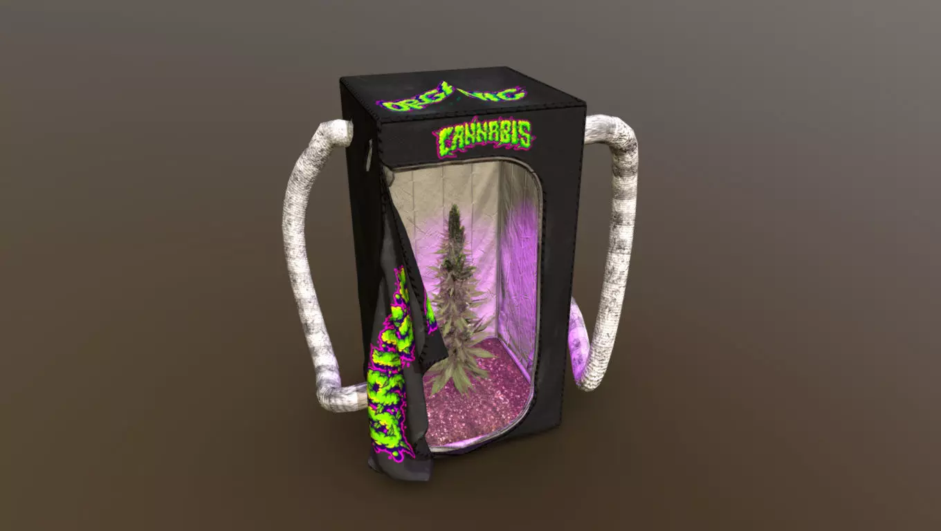 High-quality 3D model of a compact indoor cannabis grow room / grow tent, created for realistic visualization in games, animations, VR environments, and product renders. This asset features a fabric grow tent with a reflective interior lining, visible ventilation ducts, and a mature cannabis plant illuminated by purple grow lighting. The exterior includes stylized graphic branding and a partially opened front flap, allowing clear visibility into the interior setup. The model includes realistic fabric structure, reflective mylar interior, flexible ventilation hoses, interior lighting glow, and a detailed cannabis plant with soil. Geometry is optimized with clean topology, clean UVs, and PBR-ready textures, making it suitable for real-time engines such as Unity and Unreal, as well as cinematic and archviz use. The asset is easily scalable, with a centered pivot for easy placement, and works well as a standalone prop or part of a larger scene. No animations are included, and final lighting appearance may vary depending on the render engine or scene setup. Ideal for modern, industrial, or underground environments.