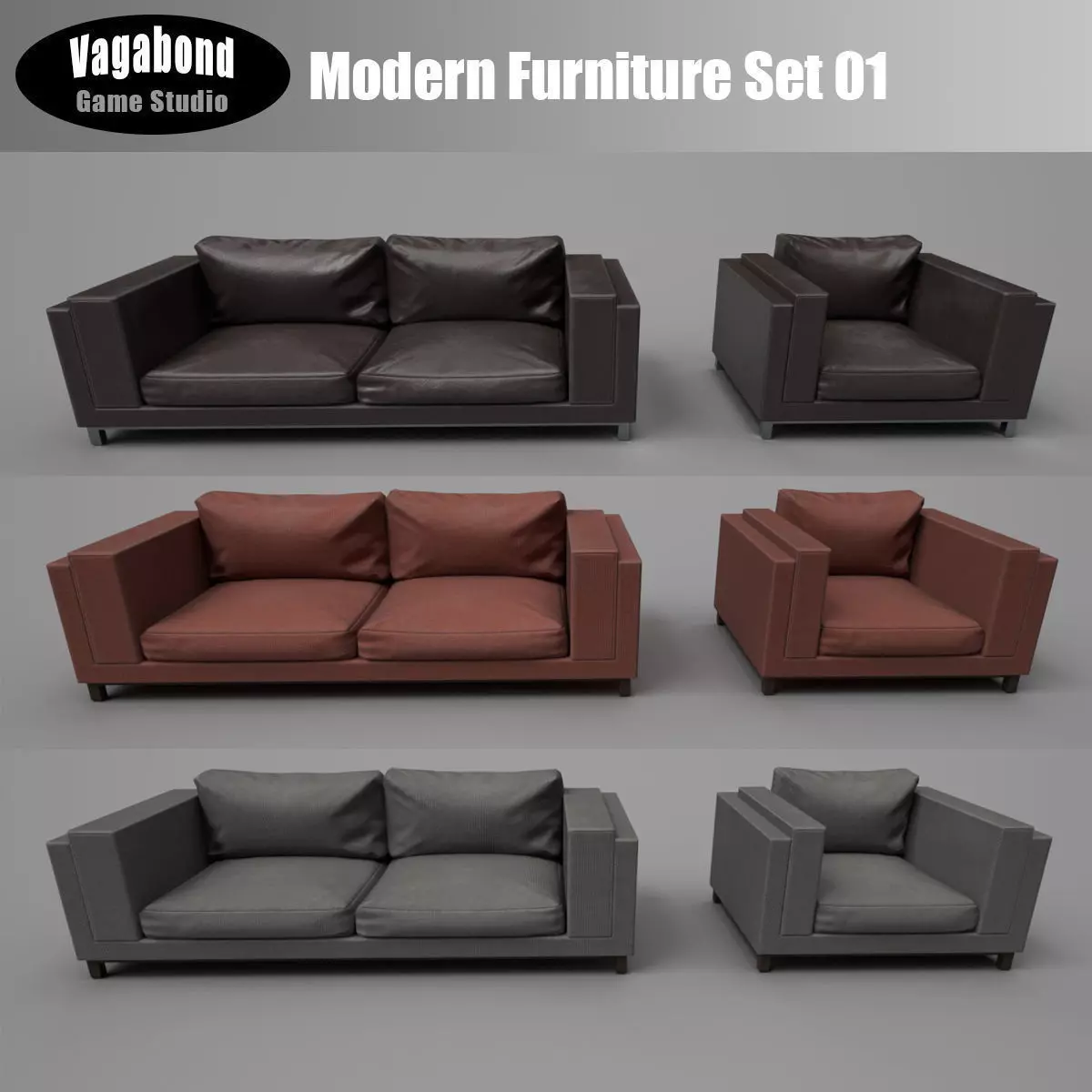 High-quality, modern style low-poly sofa and chair, with 3 different 4096x4096 PBR texture sets (including Metal/Rough and sets optimized for Unity and UE4), ready for use in realtime visualizations.