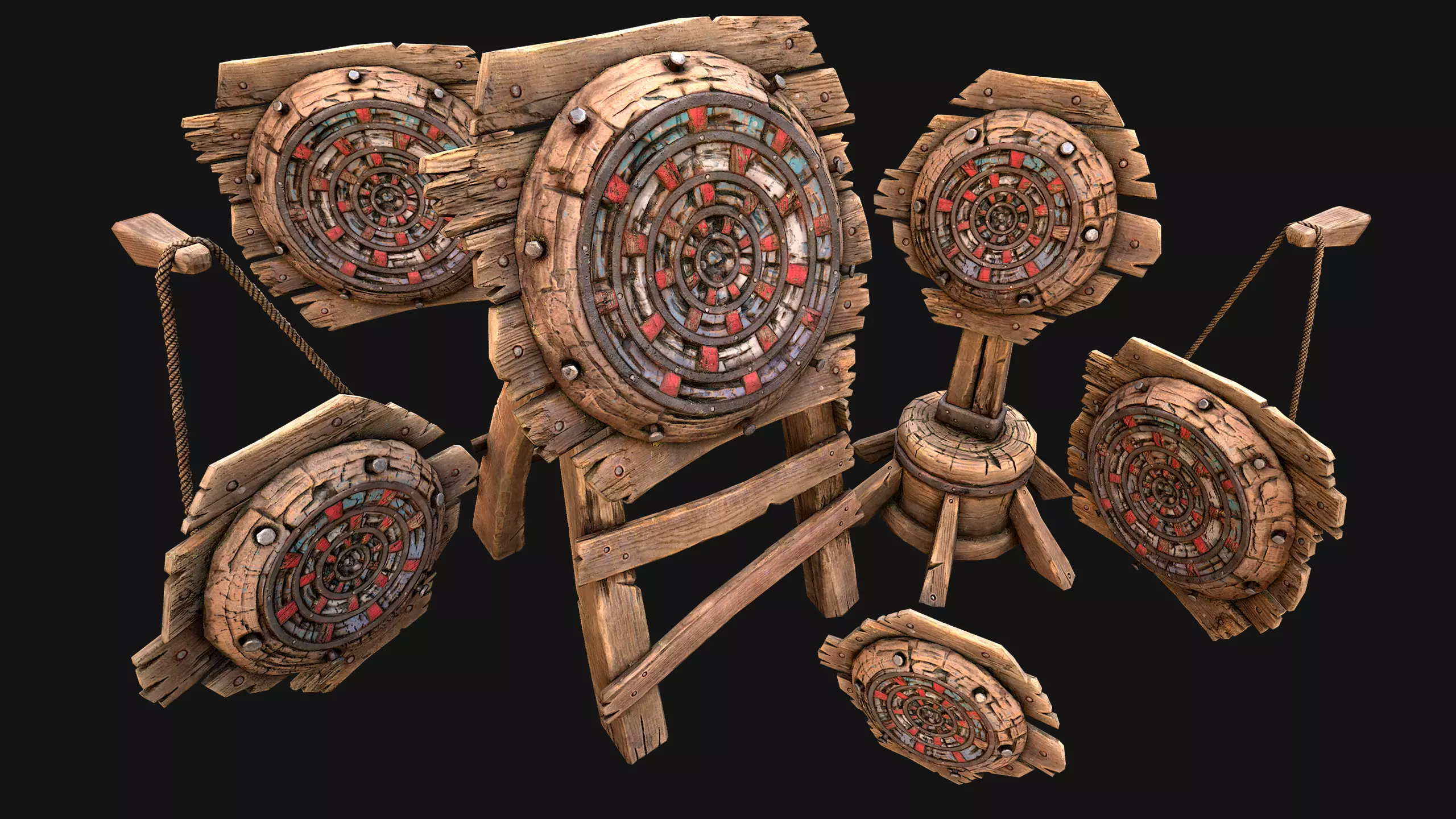 Game ready models .The models contains lods, detailed information on the images.Stylized and detailed Medieval Wooden Target set fully textured, sculpted and rendered with Physical based rendering (PBR) - Shown images have been rendered in Marmoset Toolbag .The set contains 6 target models.