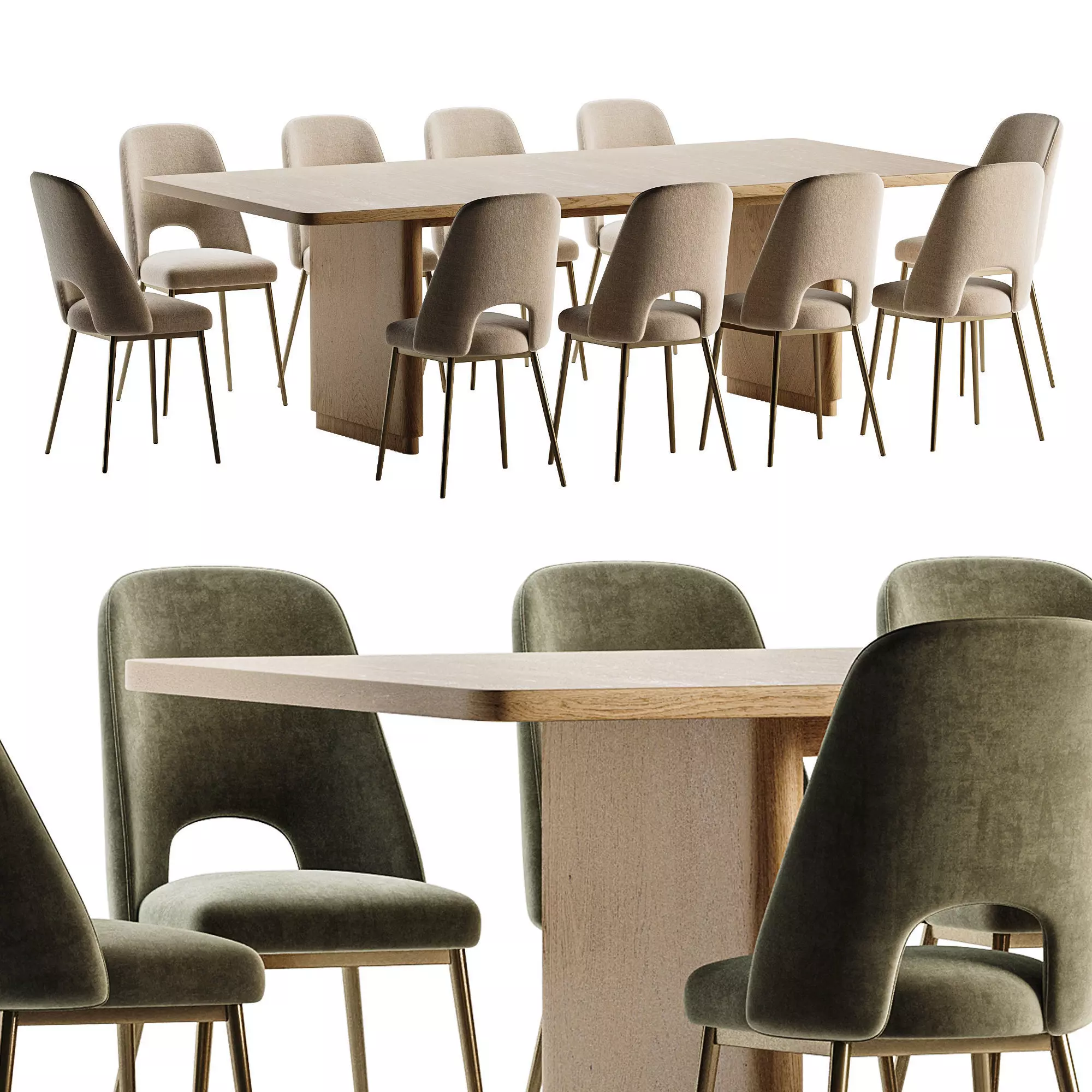 Chair: https://www.homary.com/item/modern-white-upholstered-dining-chair-set-of-2-with-hollow-back-gold-legs-43387.htmlTable: https://www.westelm.com/products/mp-rina-curved-oak-pedestal-dining-table-88-104-mp212/?pkey=cdining-tables&position=5