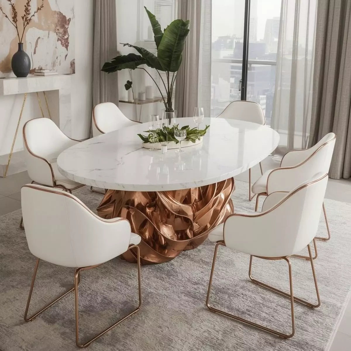 Introducing a stunning fusion of luxury and modern elegance, this Oval Dining Set is the perfect centerpiece for any contemporary home. Featuring a sleek, white marble table top with a luxurious rose gold base, this design combines minimalism with sophistication, creating a space that feels both stylish and inviting. The sculptural base, with its unique wave-like curves, adds a dynamic touch to the overall design, making it not just a functional piece of furniture, but an art statement in itself. The clean, ergonomic chairs are upholstered in premium white leather, offering ultimate comfort while enhancing the overall aesthetic. Ideal for high-end dining spaces, this set brings class and warmth to any room.