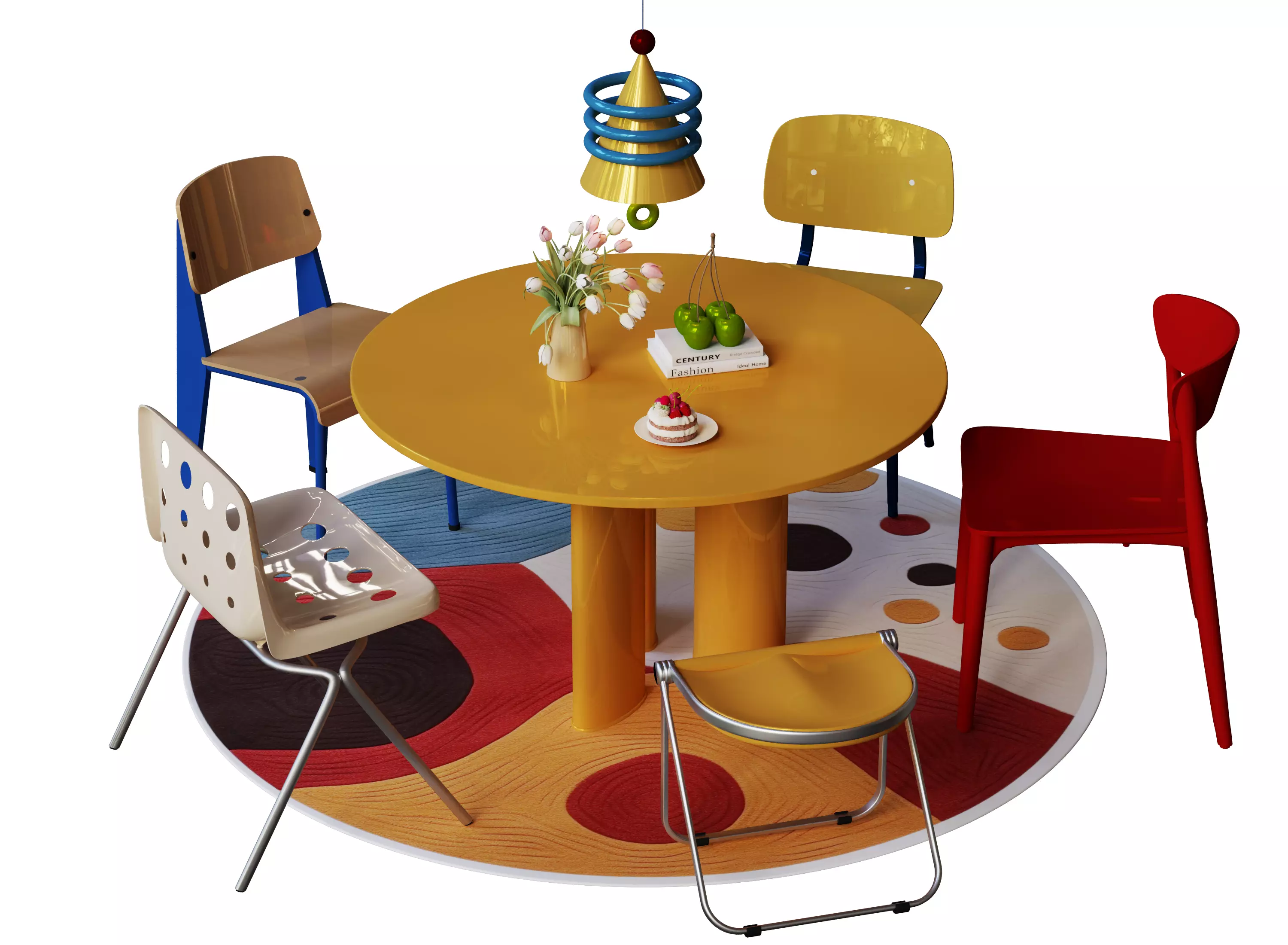 [General Overview]This is a high-quality, professional 3D model of a vibrant dining or cafe furniture set inspired by Memphis and Bauhaus design movements. The set includes a minimalist circular dining table, five uniquely designed chairs (including metal, wood, and plastic variants), a decorative abstract rug, and a creative pendant light. It is ideal for modern interior visualization, commercial space design, or artistic CGI projects.[Key Features]Unique Design: A curated collection of diverse seating styles that blend retro aesthetics with modern functionality.V-Ray Optimized: Fully textured and lit using V-Ray. Materials are physically accurate (PBR ready) for high-end rendering.Clean Topology: Optimized mesh flow for smooth performance and easy modification.Multi-Format Compatibility: Includes native 3ds Max files and professionally exported FBX and OBJ formats for seamless use in Blender, Cinema 4D, Unreal Engine, or Unity.[Technical Specifications]Software: 3ds Max 2018 or higherRenderer: V-Ray Next / 5.0 / 6.0Formats: .MAX (Native), .FBX, .OBJ, .MTLUnit System: Metric (Millimeters)Textures: High-resolution maps included (Diffuse, Glossiness, Normal, Reflection).