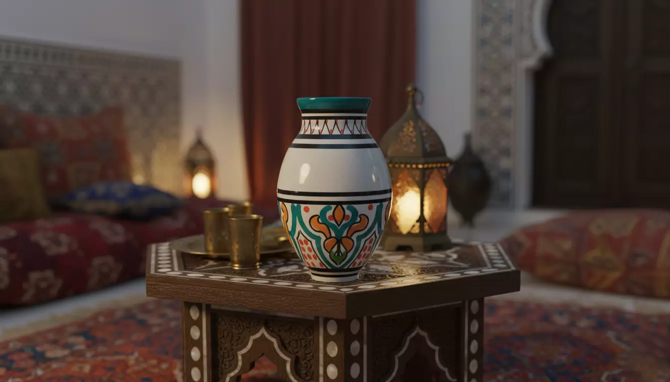 This 3D model showcases a traditional Moroccan ceramic pot, inspired by the rich artisan pottery of Fez and Safi.It features colorful hand-painted geometric and floral patterns, and a glossy glazed surface for realistic reflections.Ideal for interior design scenes, cultural visualization, or decorative renders.