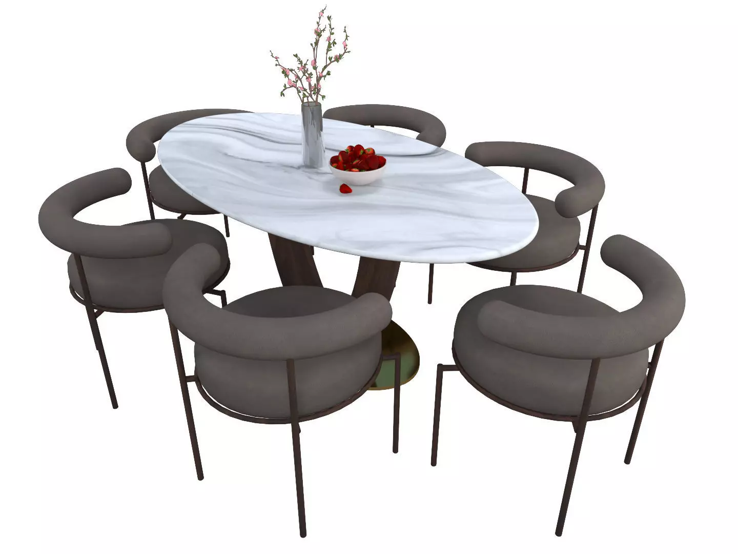Oval shape Dining Table & curve Chair set with decor. Custom shape table base in wood.