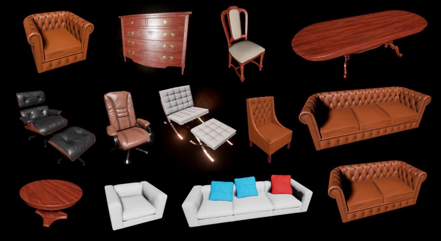 PBR furniture pack contains 15 different low-poly models of furniture.