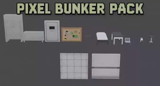 Pixel_Bunker is a stylized low poly 3D props pack with pixel art textures, perfect for retro, post-apocalyptic, military, or sci-fi games.