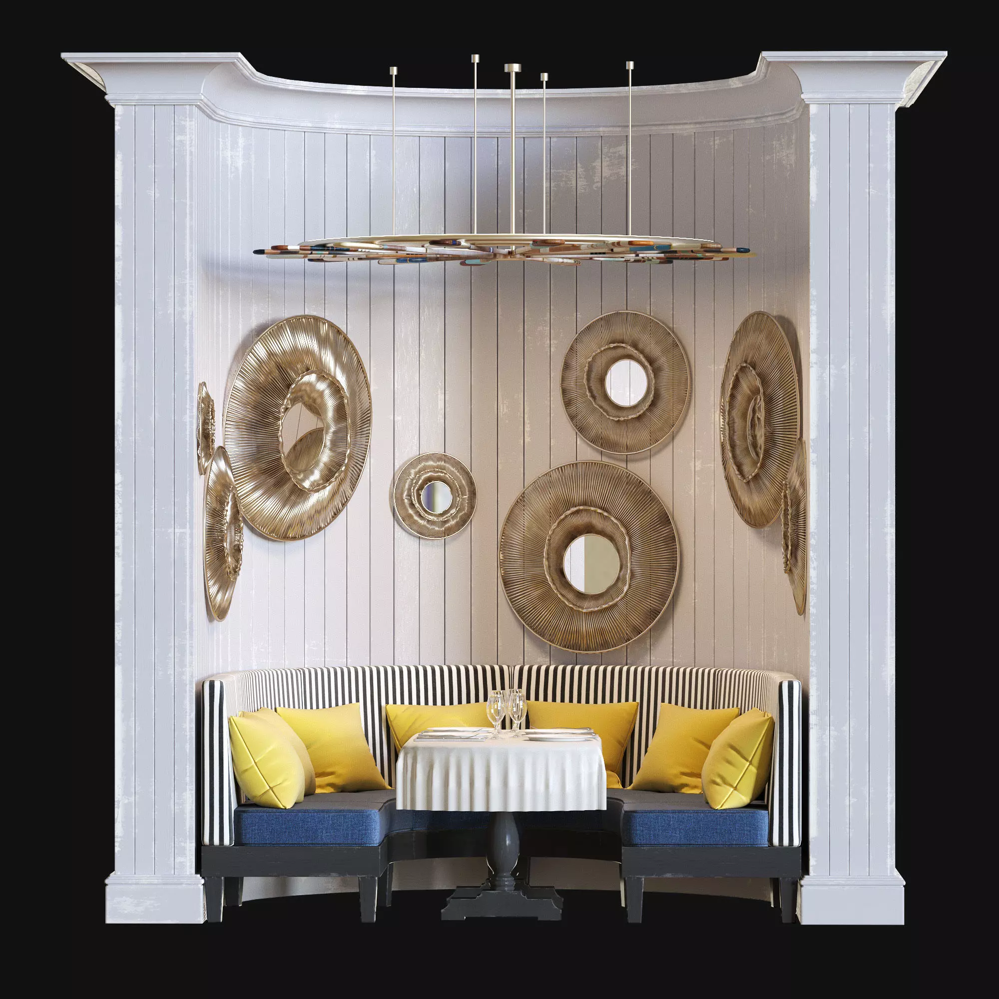In structure:WallSofaPillowsTable with tableclothLayingLamp of oarsMirrors