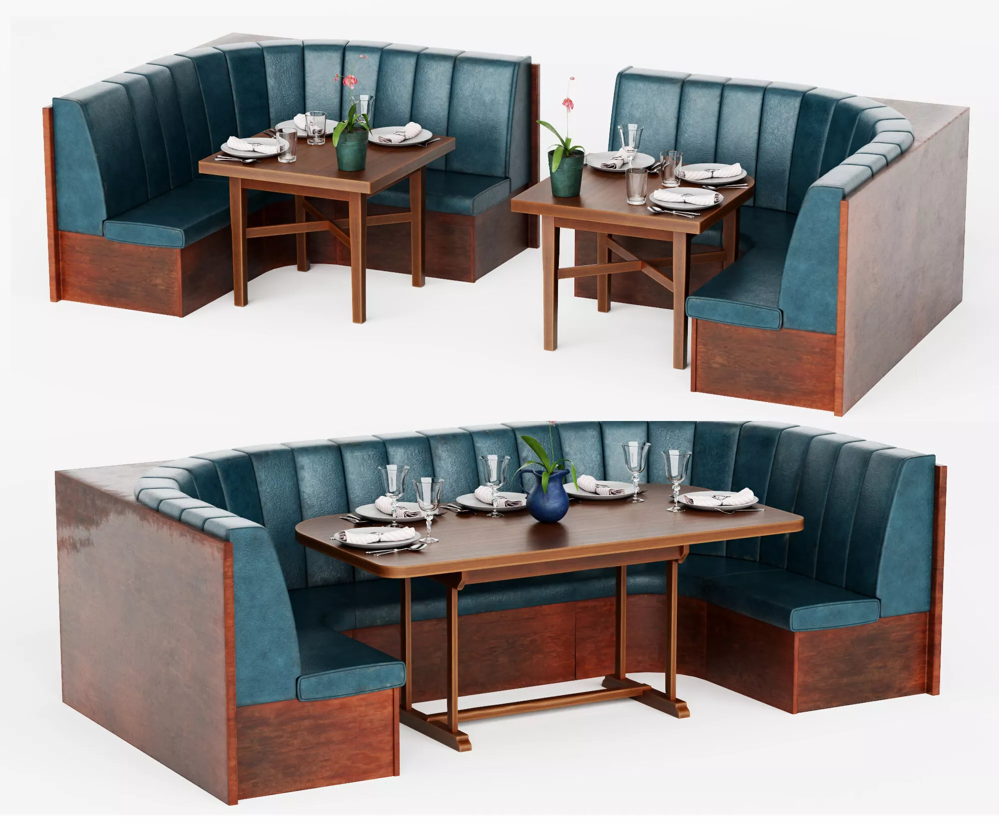 Professional high-quality 3D collection of Restaurant Booth Seating and Dining Tables meticulously crafted for premium hospitality visualization commercial interior design and restaurant staging projects. This comprehensive asset pack features modular U-shaped and corner booth configurations with realistic tufted blue leather upholstery rich dark wood tables and fully set table decors including glasses plates napkins and decorative plants with realistic PBR materials.