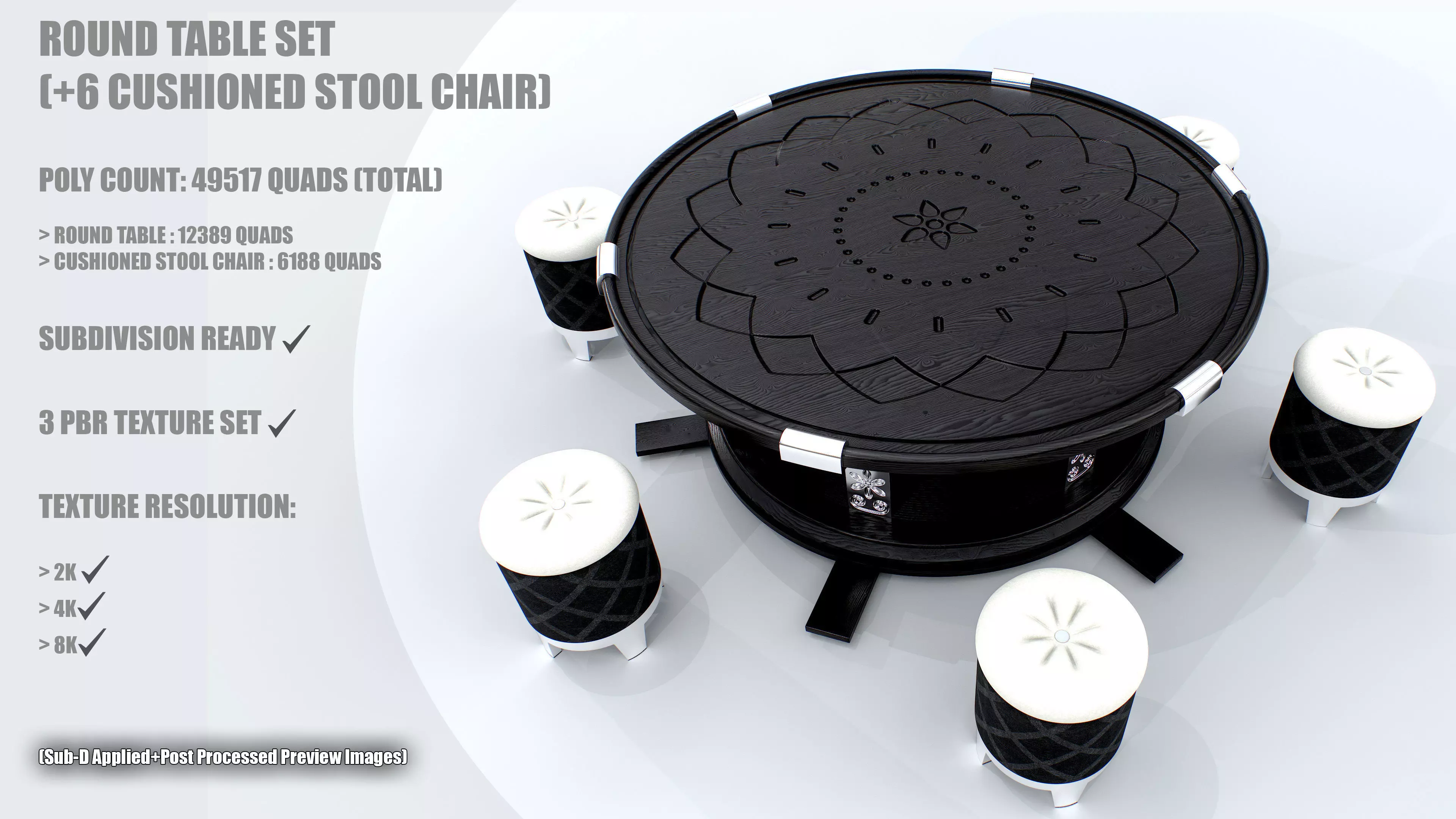 A Mid-Poly Model of a Round Table with 6 Cushioned Stool Chairs.