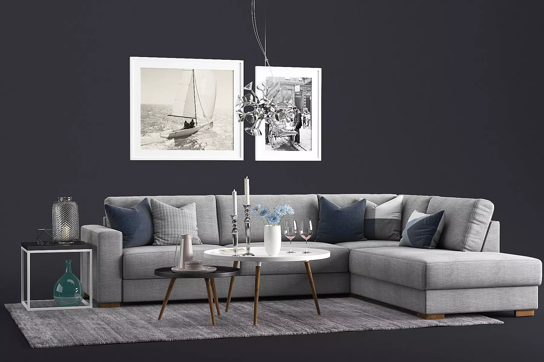 High quality 3d models of a complete sofa setup with tables, lamps, framed pictures, carpet and accessories with all maps included. For high polycount pillows can be unchecked meshsmooth.All models are real based on size from the manufacturers, made carefully after references from scandinavian design Every model is complete in various format, textured, grouped, centered and ready to render.