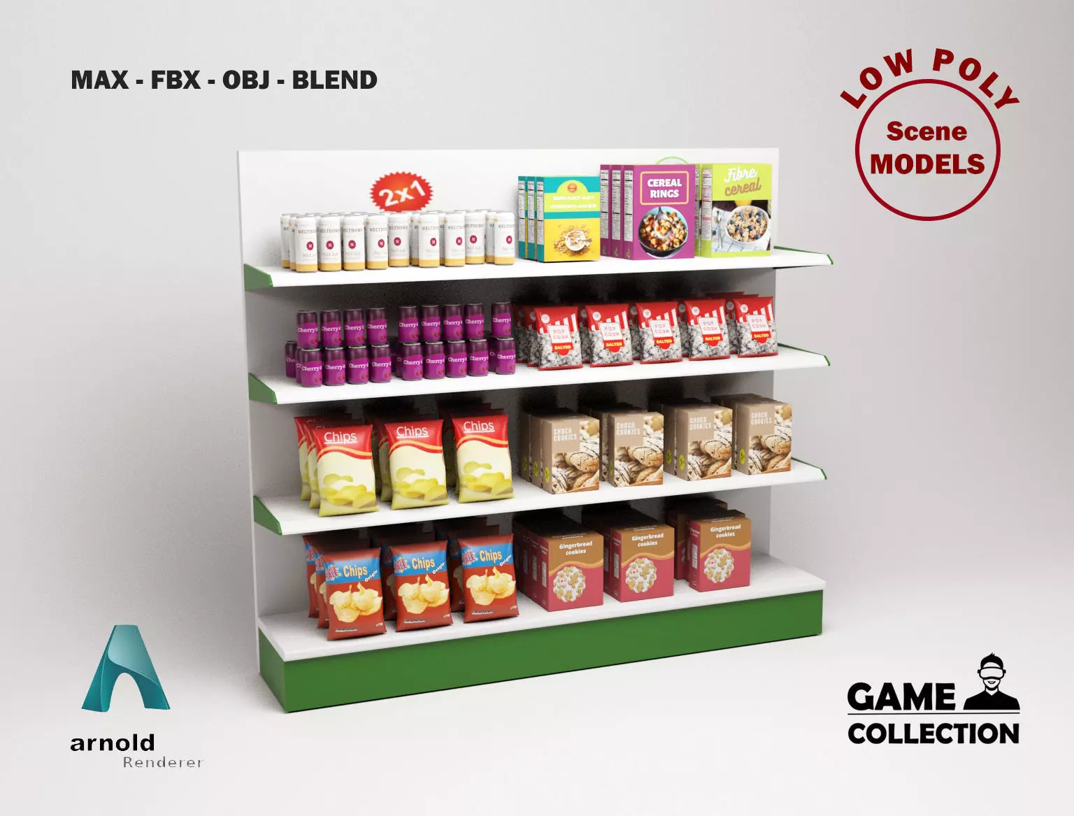3d model of a store shelving with different products (chips, cereals, drinks, cookies). The models has been created with 3D Studio Max 2022 and Blender 3.3. All the models are low poly, basic but realistic and are ideal for 3D scenes that require few polygons. They can be used for advertising visualitations and also for games or applications. It has been created in different 3D Studio Max versions and also in FBX, OBJ and blend.