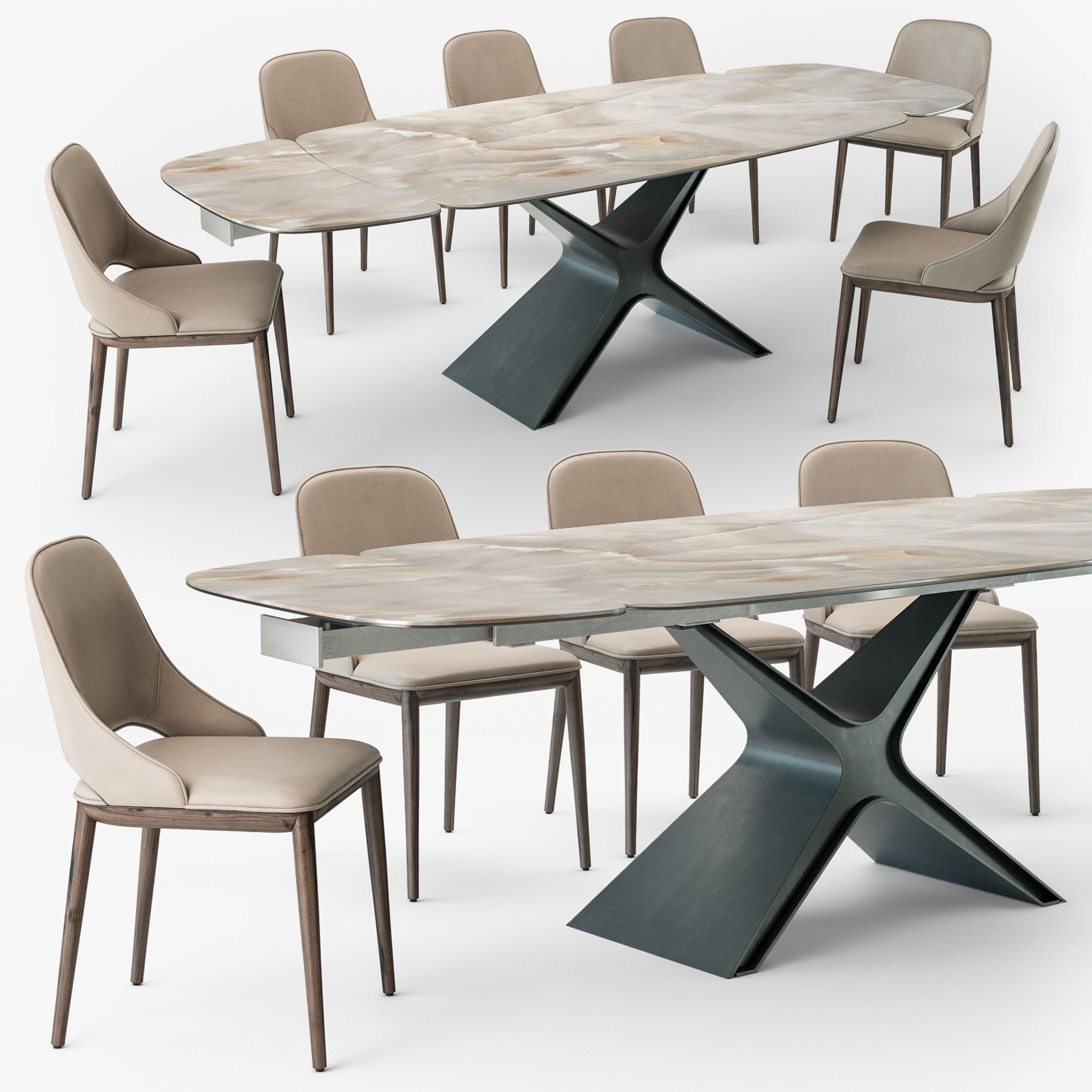 Calliope table combines the beauty of steel, its strength and durability, its feeling of modernity, with the luxury of ceramic, glass, or porcelain.