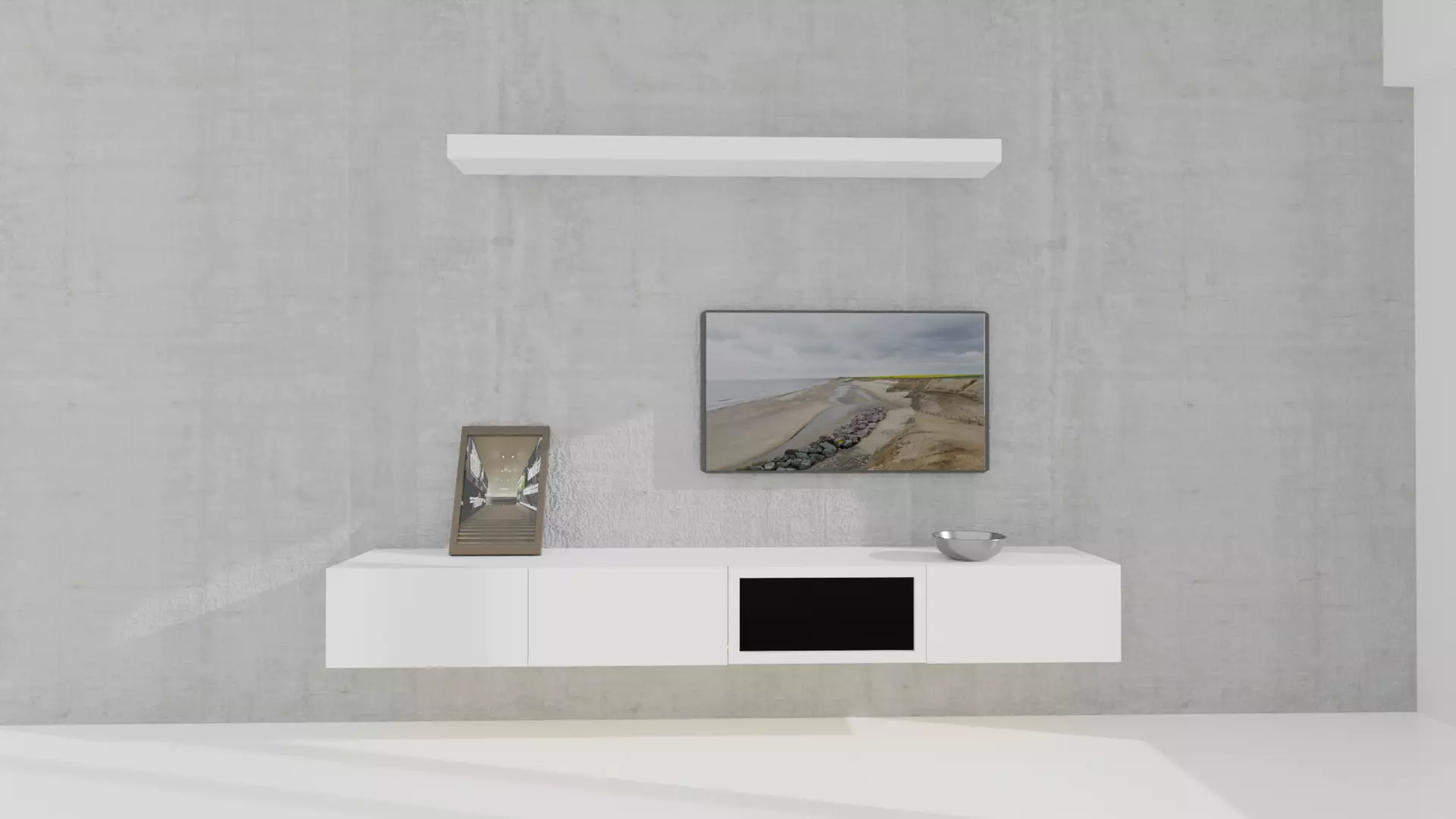 The above Tv unit design has a contemporary look that is unwrapped for easy modification. Besides the Tv unit the ,design also has a photoframe with editable photo plane.The same is with the tv where you can add the suitable image as per your requirement.The background has the concrete texture which complements the Tv unit . With proper lighting a Photorealistic look can be achieved as shown in the reference image.The Tv unit aslo has light at its base to highlight the tv unit.