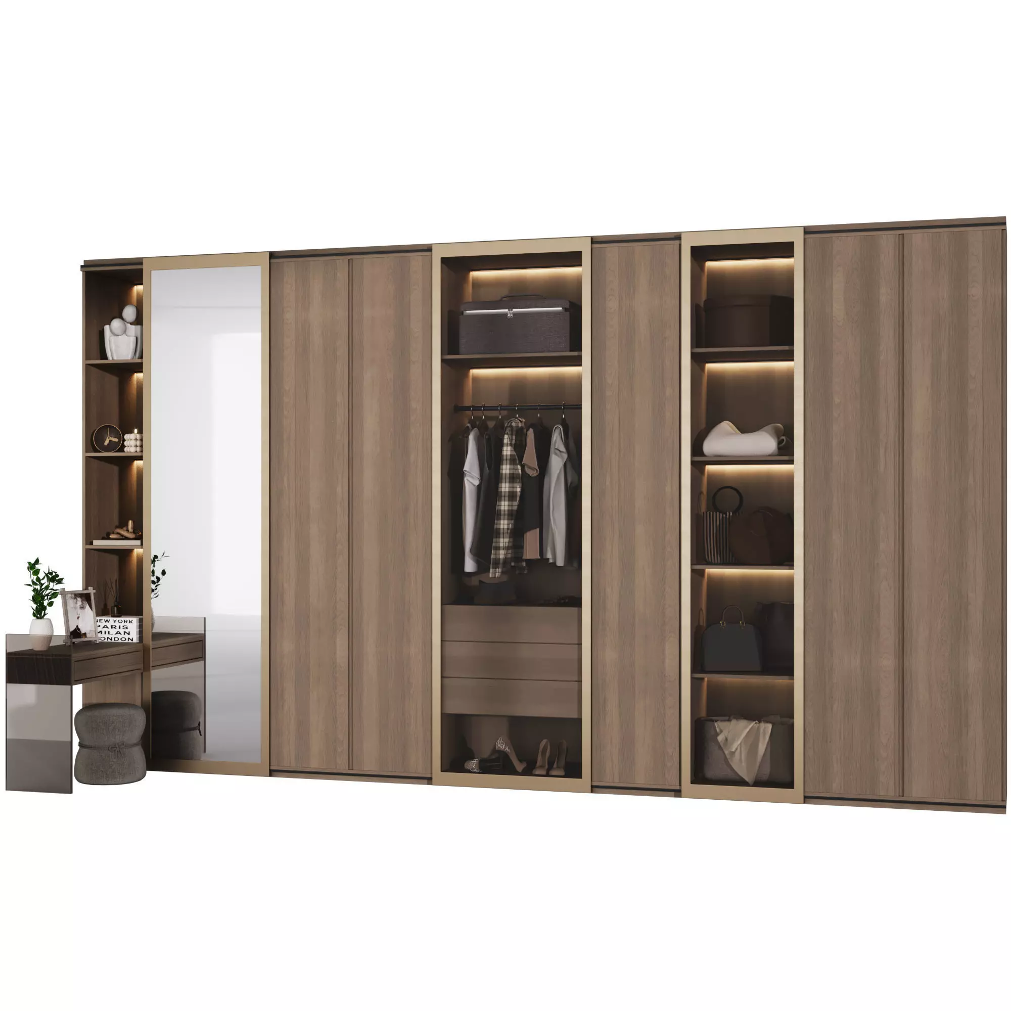 Dressing room in a modern L-shaped style with filling. The cabinet model consists of modules and is easy to edit. Part of the cabinet is covered with wooden facades, and the other part is covered with sliding doors made of glass and mirror. Also, the cabinet design has a makeup table with a glass leg and illuminated shelves for a variety of decor.