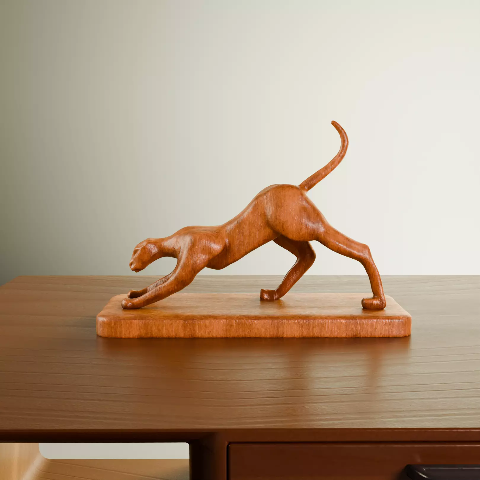 The sculpture is crafted with a stylized, minimalist approach, avoiding excessive detail while preserving the recognizable anatomy and graceful posture of a feline form. Its elongated body, arched back, and raised tail create a dynamic silhouette that reads clearly from any angle, making it ideal for shelf styling, tabletop decor, and close-up product renders.