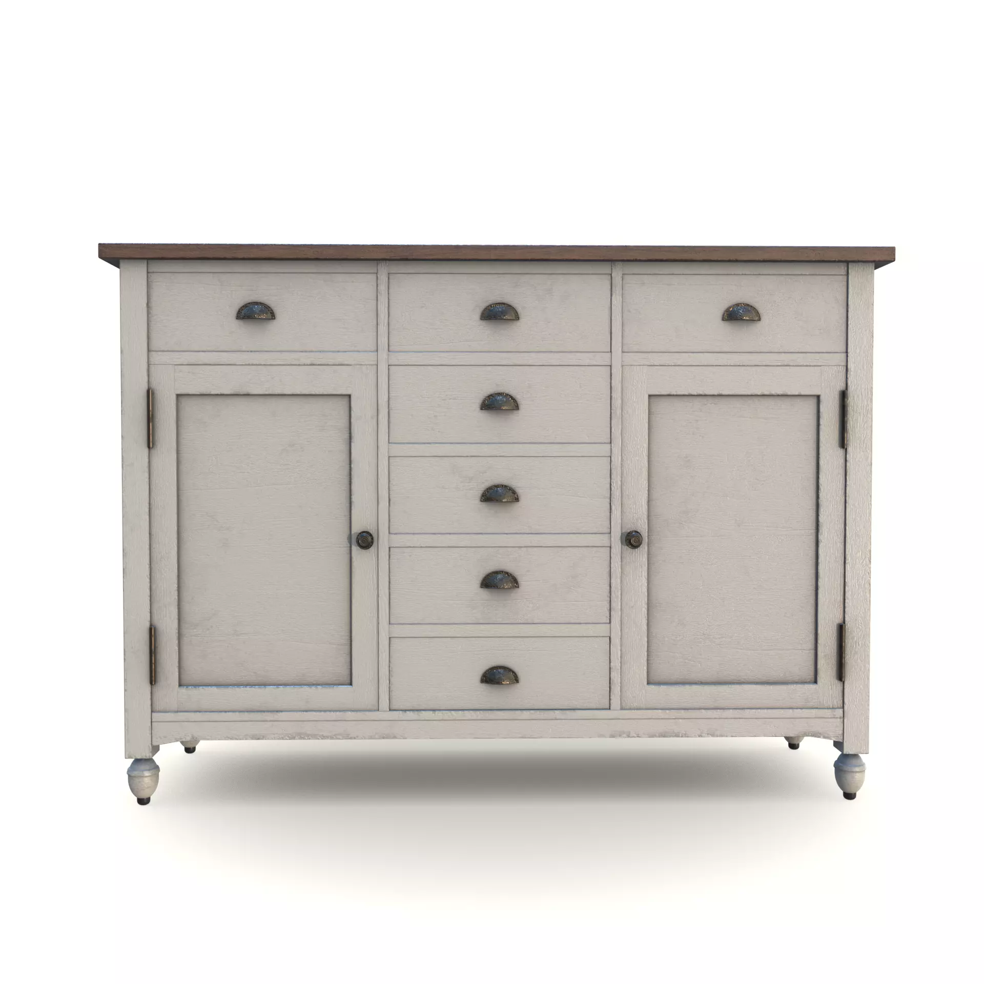 Embrace the charm of shabby chic with this buffet table featuring a distressed cream finish and delicate floral patterns. Made from reclaimed wood, it showcases curved legs and decorative metal drawer pulls. The table offers storage with drawers and cabinets, infusing your dining space with a romantic and vintage-inspired ambiance.