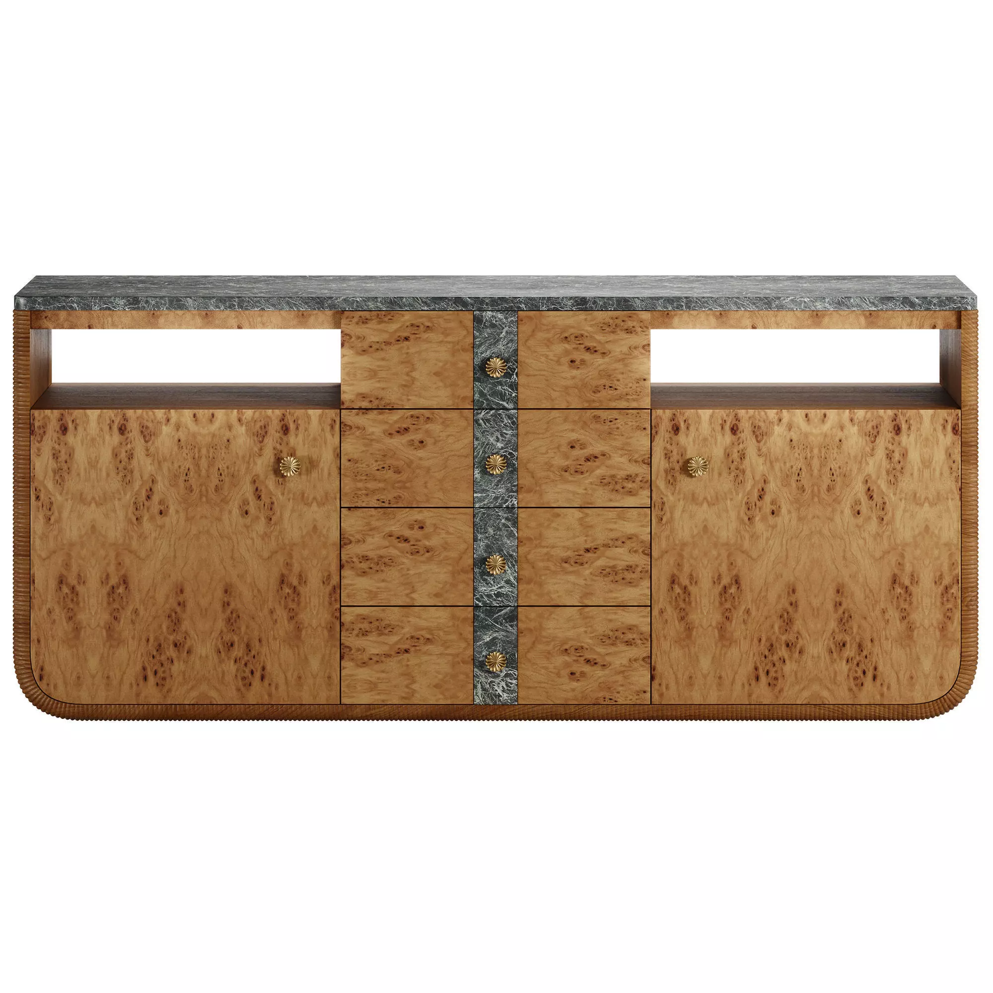 Basil Sideboard by Soho HomeA rectangular unit is characterised by a honed Napoli green marble top and oak burl storage drawers.The Basil sideboard has two oak burl doors with adjustable shelves and four drawers, accented with honed Napoli green marble and handles in an antique brass finish. This sideboard provides extra storage with open shelves on both sides.