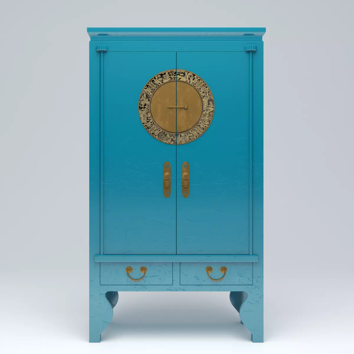 Antique Chinese wedding cabinet: Two doors over two drawers / brass hardware / blue lacquered surfaces
