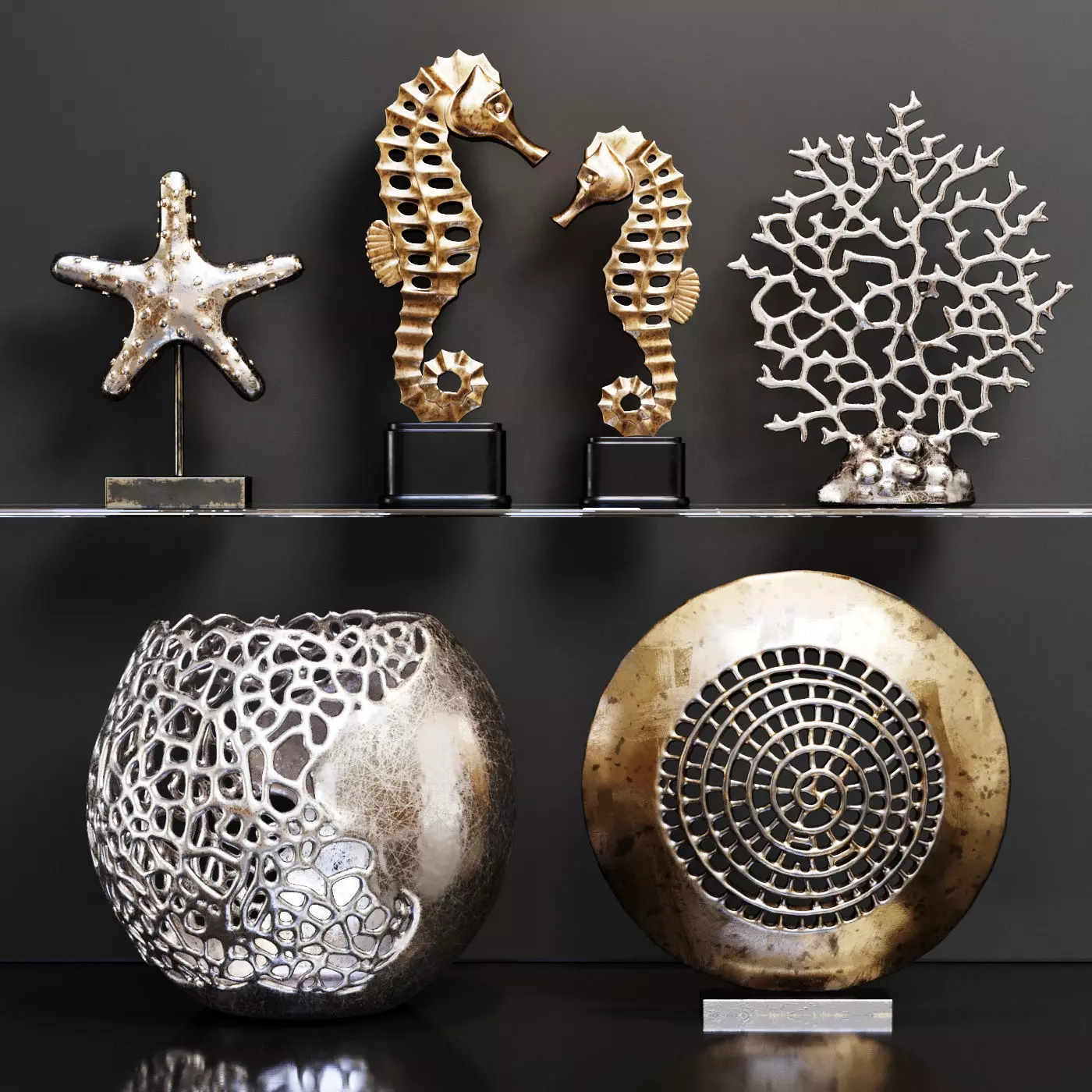 - seahorse sculpture set of 2  - coral sculpture  - vase  - starfish sculpture Polys 109574Verts 108646