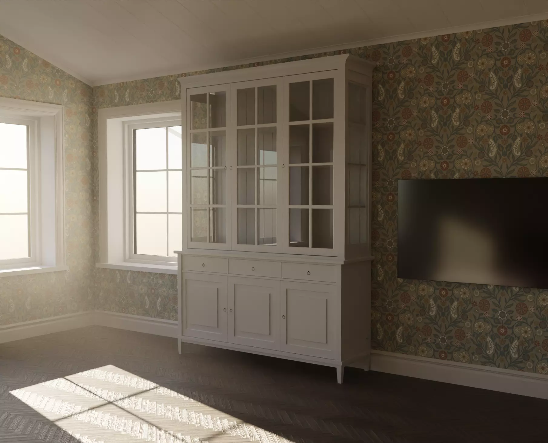A simple display cabinet, with glass doors and gray colour (colour can easily be changed)