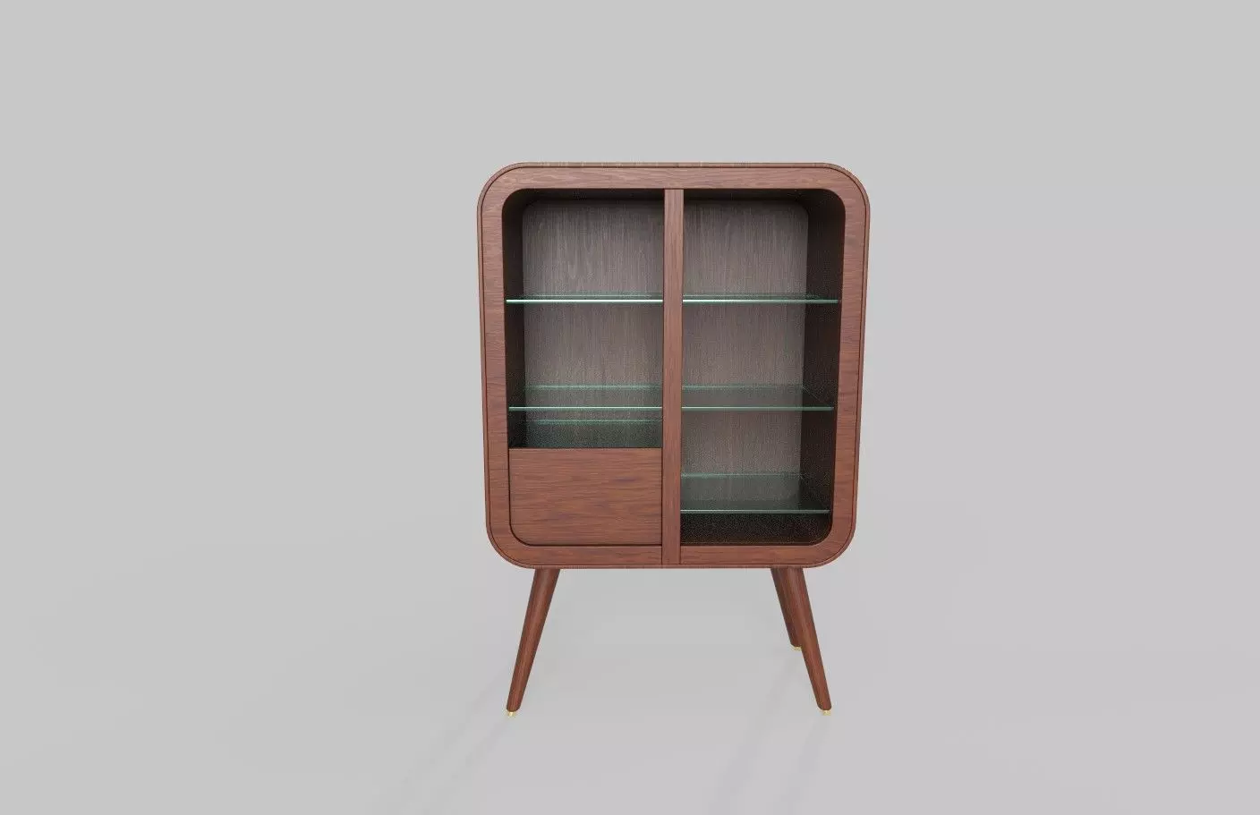 Channel retro vibes with this display cabinet inspired by the mid-century era. It is crafted from walnut veneer and features a warm walnut finish. The cabinet showcases a unique curved structure with glass panels and open shelving. The tapered legs and brass accents complete the retro look.