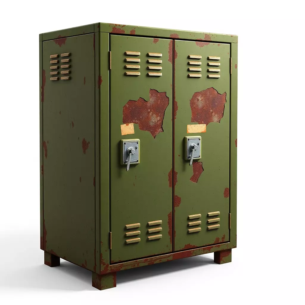 This highly detailed 3D model represents a distressed industrial metal locker, featuring a vibrant, faded green paint finish heavily weathered with extensive rust and peeling effects. The design captures an authentic vintage or post-apocalyptic aesthetic, perfect for adding realism and character to various digital environments. It is meticulously crafted with clean topology, making it suitable for both close-up renders and integration into larger scenes. The model is fully UV unwrapped and comes with a comprehensive set of PBR (Physically Based Rendering) textures, ensuring photorealistic rendering across different lighting conditions and engines. Ideal for game development, this asset can enrich post-apocalyptic settings, abandoned buildings, horror games, or industrial environments. It also serves as an excellent prop for architectural visualizations requiring a raw or gritty feel, as well as for film, animation, and AR/VR applications where environmental storytelling is key. The model is optimized for real-time applications while maintaining a high level of visual fidelity, ensuring efficient performance without sacrificing detail. Supported file formats likely include GLB, FBX, OBJ, USD, ABC, DAE, and PLY, providing versatility for various 3D pipelines. Its detailed textures and robust construction make it a valuable addition to any asset library seeking authentic, aged industrial props.