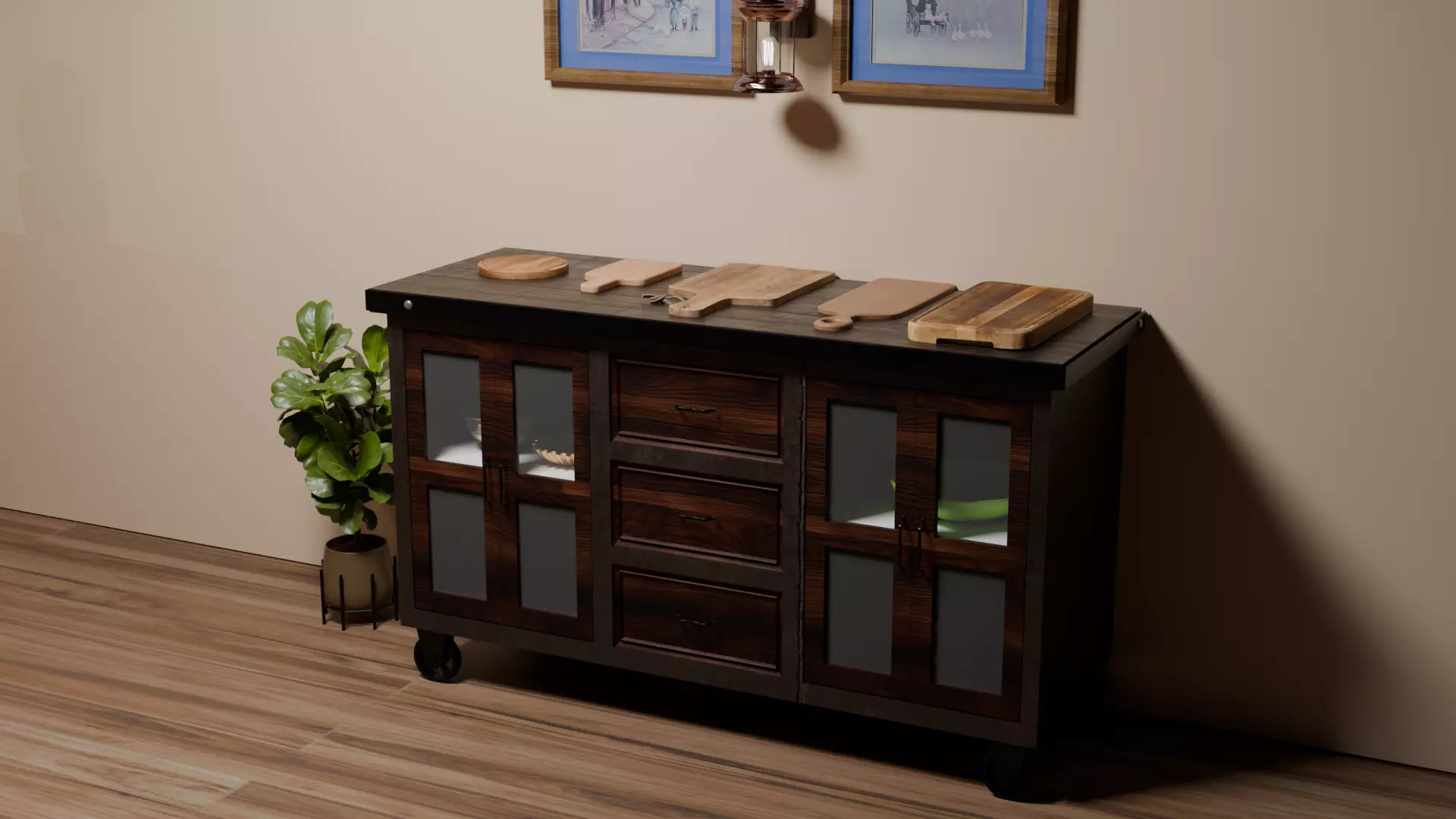 This industrial sideboard blends rugged utility with refined craftsmanship. It features a dark wood body accented by black metal hardware and a sturdy metal band running around the countertop, secured with detailed rivets for an authentic workshop aesthetic. The piece rests on four functional casters, giving it both mobility and a bold industrial character. The doors and drawers are crafted from slightly lighter or differently finished wood, creating a subtle contrast that adds depth and visual interest. Each component feels purposeful—strong lines, durable materials, and an emphasis on texture make this sideboard as practical as it is stylish. Perfect for lofts, modern rustic interiors, or any space seeking a statement piece with a touch of industrial charm.