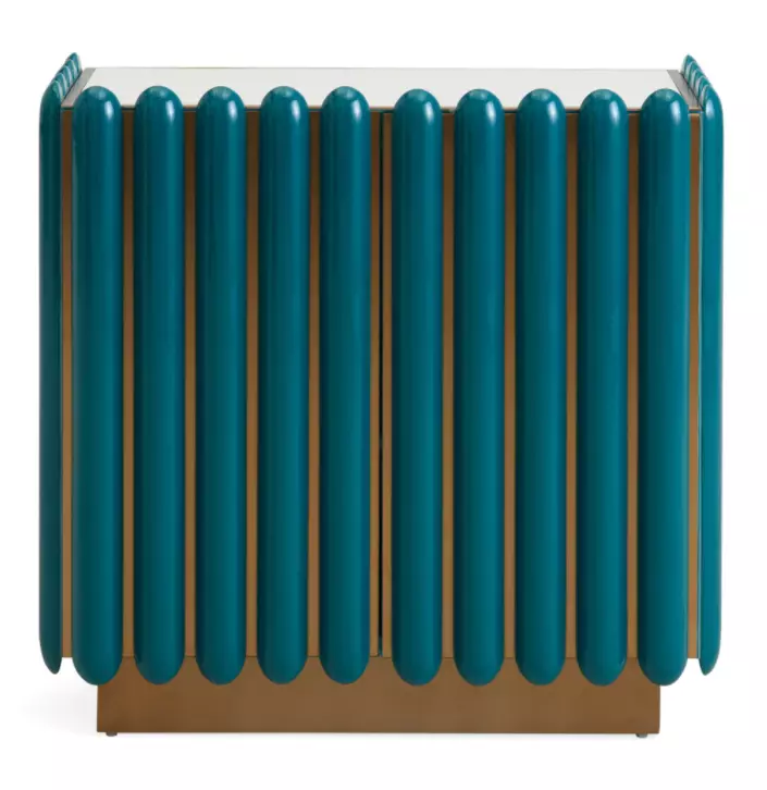 A brushed brass cabinet faced with puffy capsules in glossy deep teal lacquer with an ivory reverse-painted glass top floating on a recessed base. Each side of its interior is fitted with velvet-lined, soft-close drawers and an adjustable shelf. Fabulously futuristic and as hardworking as it is glamorous.