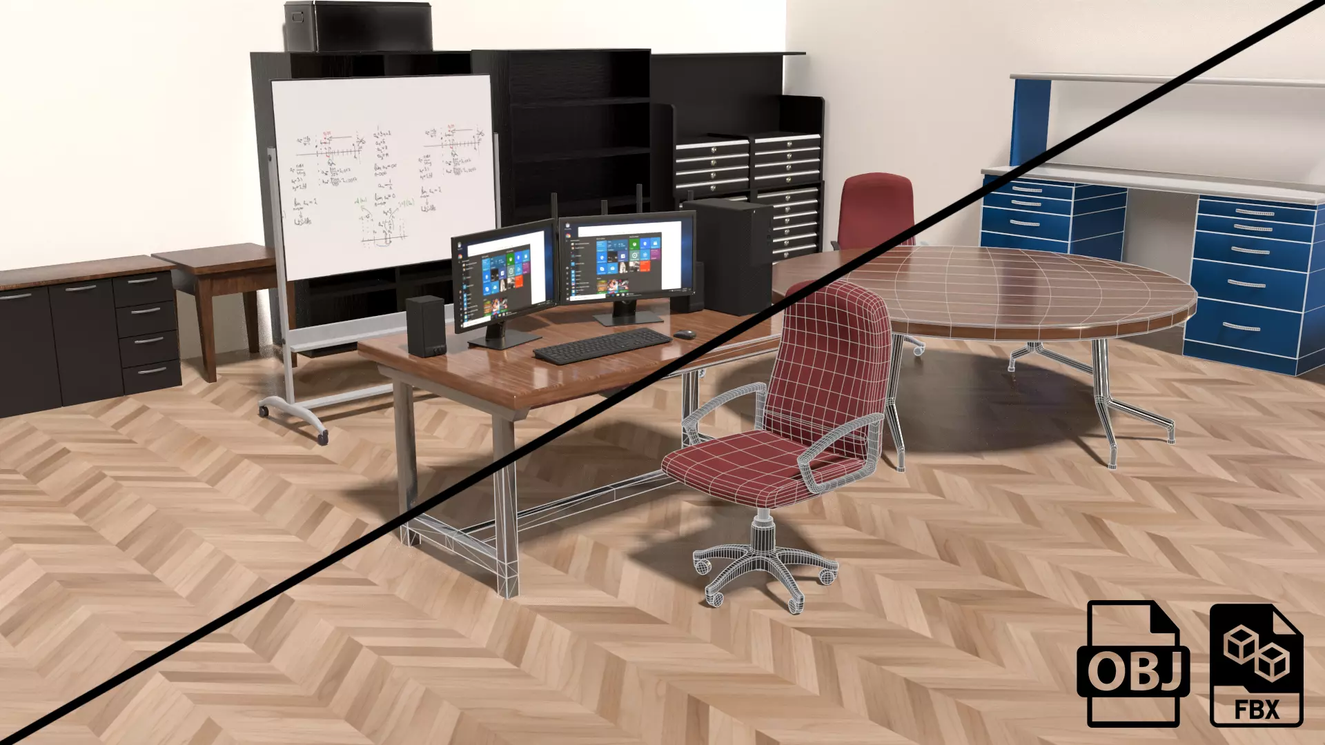 In source file you will find SUBSTANCE PAINTER files, so you can easily change texture of chair or pc etc.