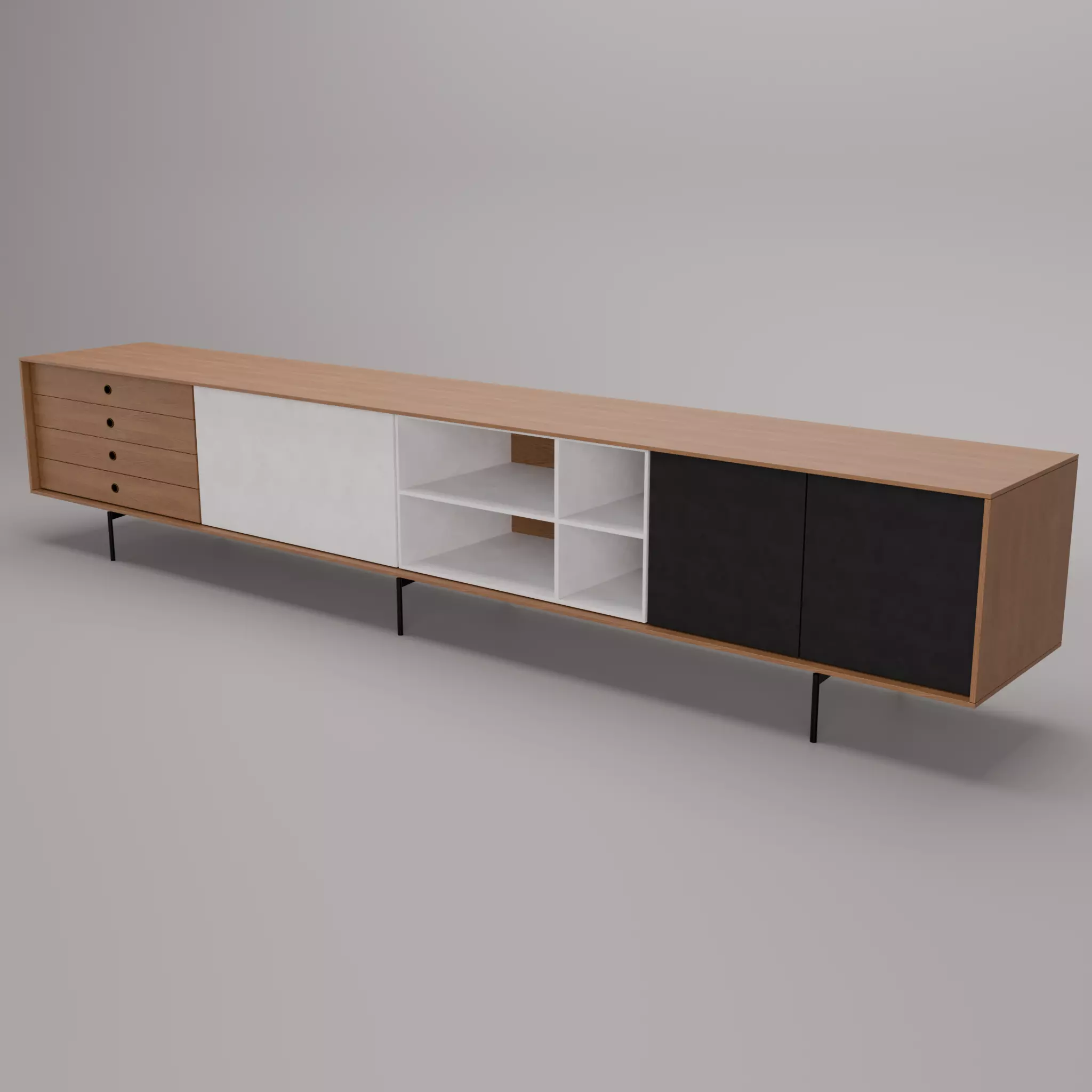 Mid-century modern designLong TV stand / sideboard formatDrawers, sliding door, and cabinetsOpen shelving compartmentsSeparate objects for easy editingReal-world scale (cm)PBR materials (base color, roughness, normal)Clean topologyOptimized geometryReady for rendering and real-time use