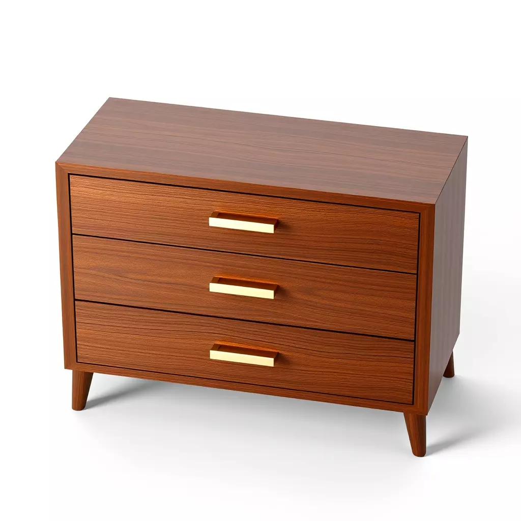This exquisitely crafted 3D model represents a modern wooden three-drawer dresser, perfect for adding a touch of contemporary elegance to any digital scene. Featuring a rich, warm wood grain finish and sleek golden handles, this piece combines functionality with sophisticated design. It is ideal for various applications, including interior architectural visualizations, realistic game environments, virtual reality (VR) and augmented reality (AR) experiences, and digital art projects. The model is meticulously detailed, ensuring a high level of realism in renders and close-up shots. With clean topology and efficient polycount, it is optimized for real-time applications while maintaining visual fidelity for static renderings. It comes fully UV unwrapped with high-quality PBR (Physically Based Rendering) textures, guaranteeing realistic material representation under diverse lighting conditions. Supported file formats typically include GLB, FBX, OBJ, USD, DAE, and ABC, making it versatile for integration into various 3D software and engines. Whether populating a bedroom, living room, or office interior, this dresser provides a professional and ready-to-use asset for your creative needs. Its accurate scale and attention to detail ensure a seamless fit into any project.