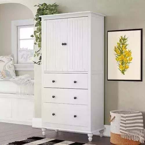 Awash in a crisp white finish, this armoire stores clothes while bringing an air of coastal style to your well-appointed bedroom. Inside, two shelves can be adjusted to suit your sartorial selections, while three drawers hold the rest of your essentials, from belts to shoes to bed linens. Ball bearing glides make opening and closing these drawers a breeze. This design stays standing.Product DetailsMaterial: Solid WoodTipover Restraint Device Included: YesAdult Assembly Required: NoShelves IncludedTotal Number of Shelves: 3Adjustable Interior Shelves: YesDrawers IncludedTotal Number of Drawers: 3