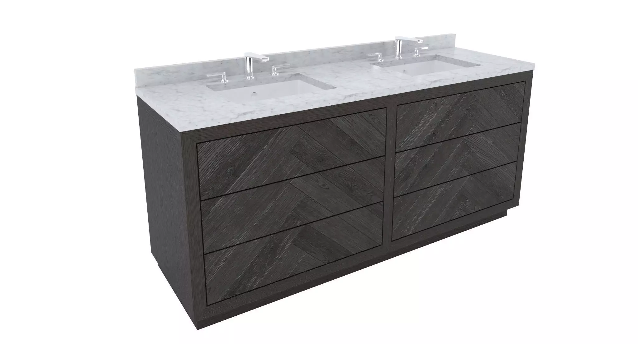 Modeled to Scale and Dimensions: 71 3/4'W x 22 3/4' D x 34'H-Cabinet Base- Polygon: 63, Vertices: 106-Sink- Polygon: 8,192, Vertices: 4,226-Faucet (each)- Polygon: 2,476, Vertices: 2,718