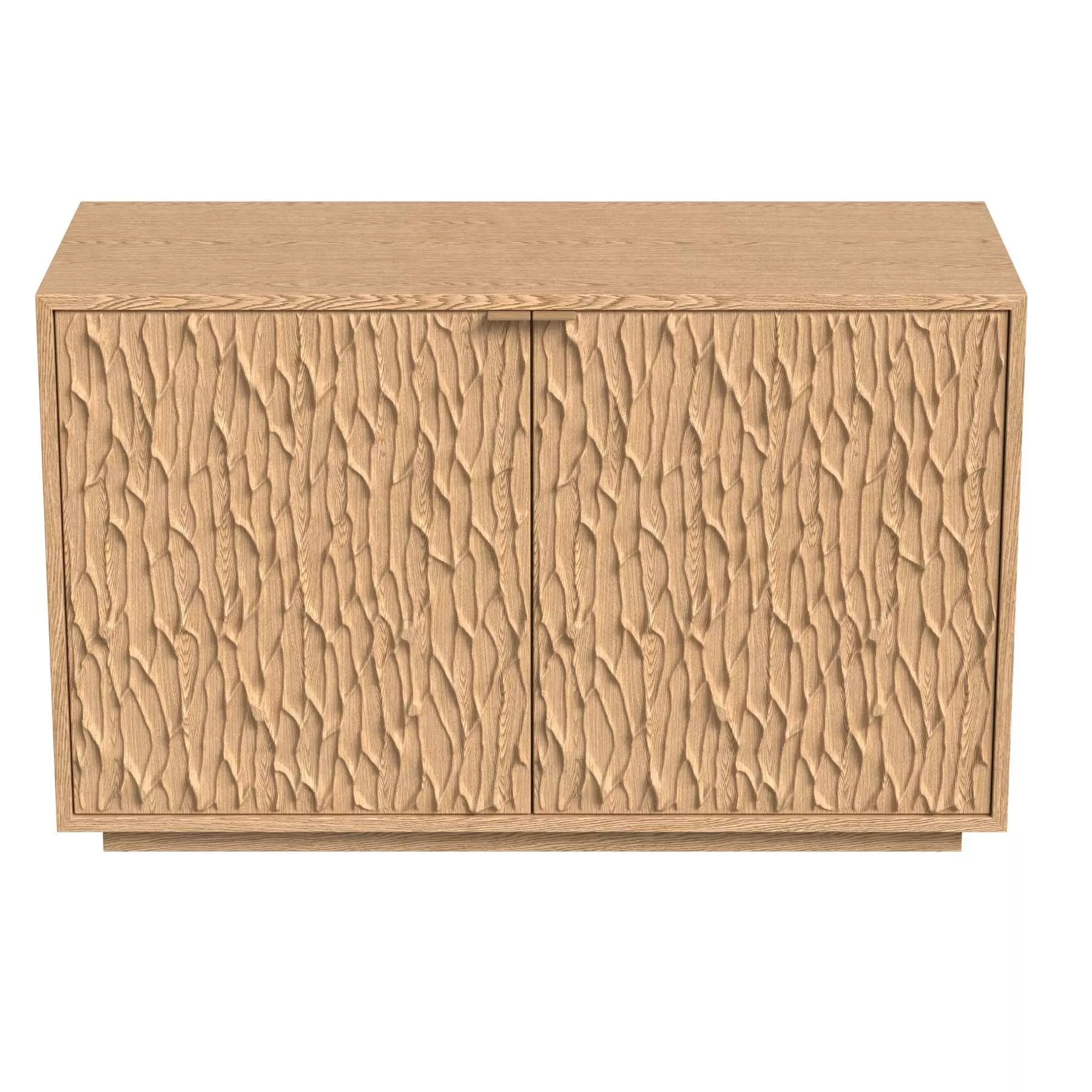 DetailsHandcrafted of engineered hardwood with American white oak veneersOak door fronts feature a deeply textured, chiseled surface in a meticulously crafted patternFinish is achieved in a multistep process in which the wood is stained and brushed by hand to showcase the natural oak grainSolid stainless steel hardware; due to its reflective nature, finish may appear to vary based on lighting conditionsDoors close smoothly on soft-close hinges1 adjustable shelfCord cutout in back panel for wire management; cord cutout has a wood grommet in a complementary finishBack of sideboard and cabinet interior are fully finishedThis item is artisan crafted with meticulous care. Given its handmade and hand-finished nature, variations in the wood are to be expected and celebrated. Each item is unique and no two are exactly alike.Use coasters under beverages to prevent marks and stainsWipe with a soft, dry cloth free of harsh chemicals or abrasive cleaning materials. Avoid direct sunlight and heat to protect the finish.