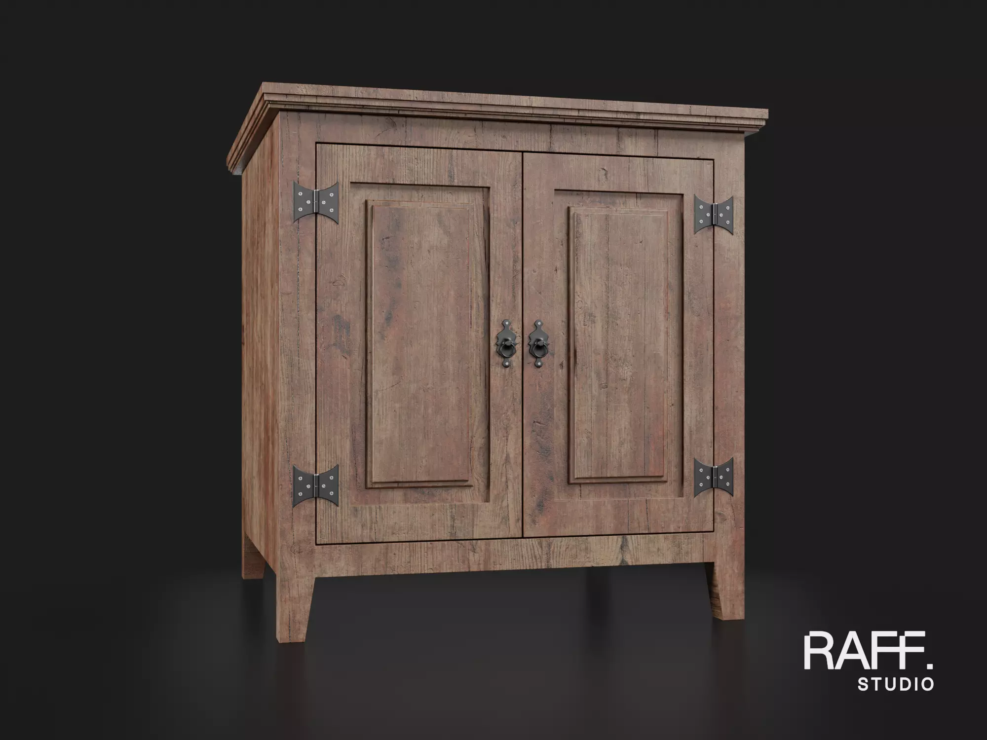 A rustic cabinet with two doors, modeled with realistic proportions and a clean, organized structure.The asset features a wooden cabinet body with metal hardware, suitable for interior scenes, architectural visualization, furniture sets, and others.